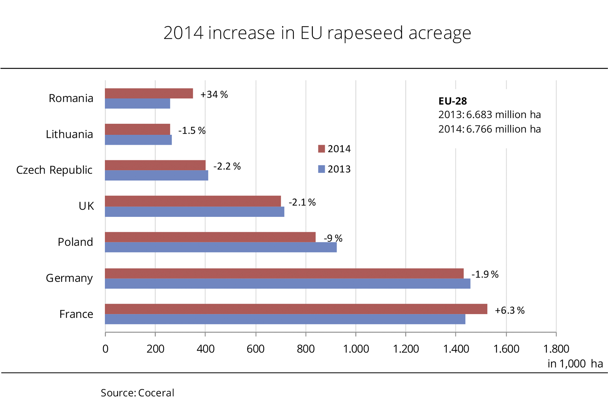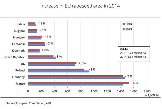 EU trade associations and the EU Commission estimate the rapeseed area for the 2014 harvest slightly higher than the previous year's figure. Coceral, the European grain and oilseed traders' association, estimates the rapeseed area in the EU-28 at 6.76 million hectares, up nearly 83,000 hectares from 2013. The forecast expects the area in most EU countries to decline or hardly deviate from the previous year's levels. However, an increase in production area is forecast for Romania, Bulgaria and France. Currently, drought is raising concerns about crop damage, especially in Eastern European countries. The first estimate puts the 2014 EU rapeseed crop at 21.15 million tonnes, up just under 400,000 tonnes from the previous year. (AMI)