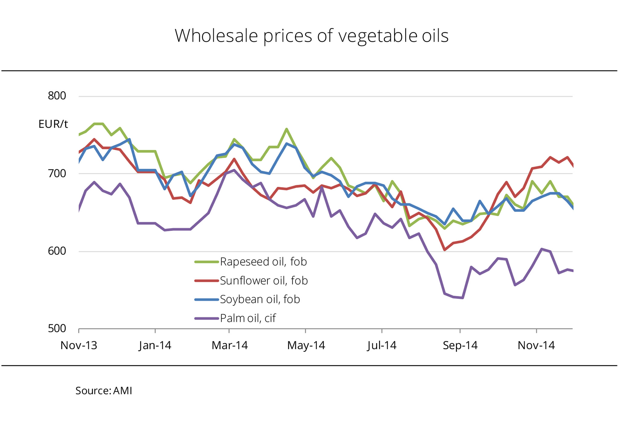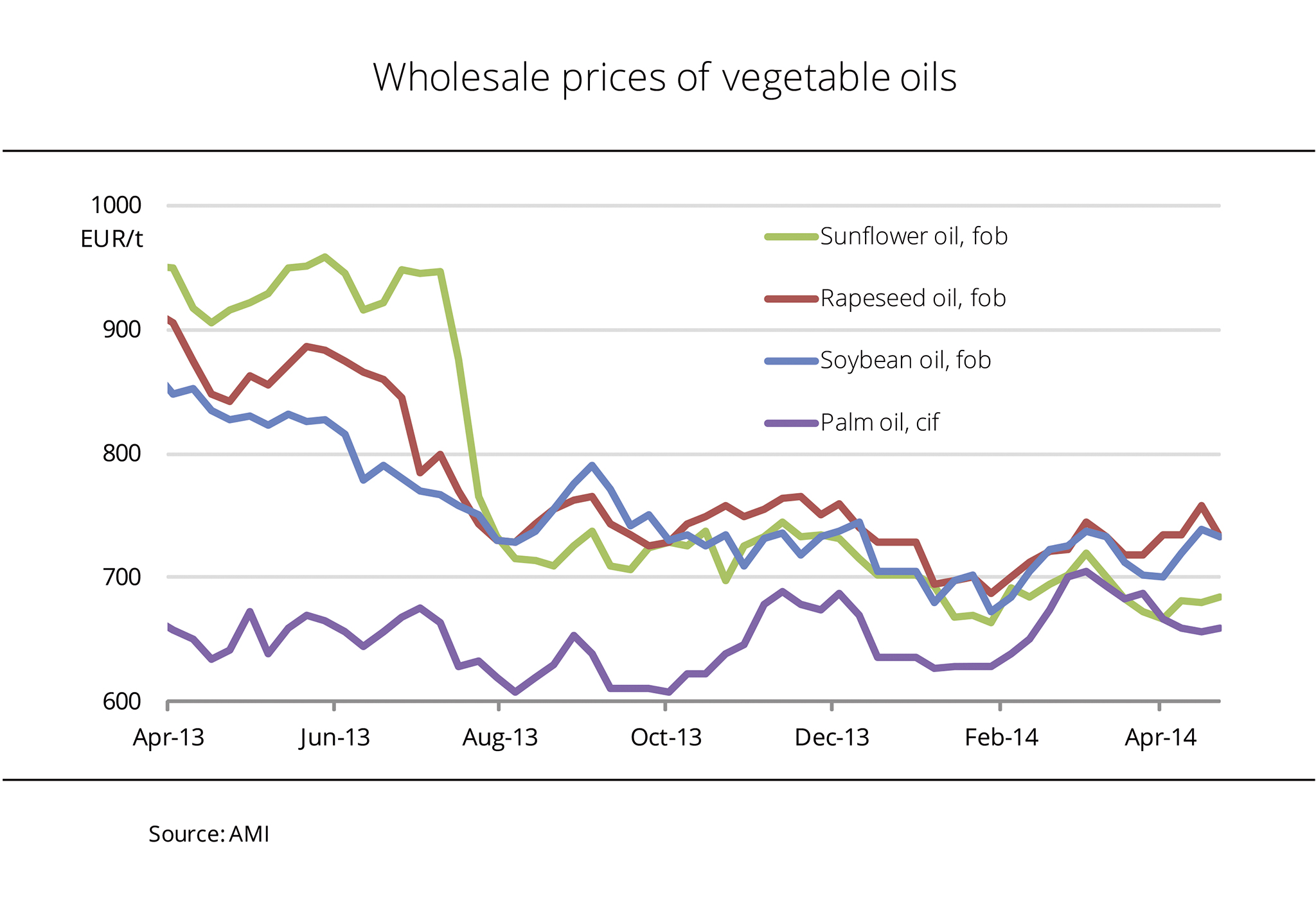 Never before have vegetable oil prices in Europe been as close as at the beginning of March 2014. The spread between the highest and lowest-priced vegetable oils was only EUR 26 per tonne. By comparison, in the previous year it amounted to EUR 250 per tonne. The reasons were the significant drop in the soft oils group on the one hand and the strong approximation of palm oil prices on the other. Due to the foreseeably tight supply, palm oil prices had jumped to levels that for some time even exceeded those of sunflower oil. At the same time, sunflower oil was down to the lowest price level in a long time. Ample supply resulting from the global bumper crop has beaten prices down. As a result, current marketing year sunflower oil prices have mostly even been lower than those for rapeseed or soybean oil. Not until the past few weeks have asking prices varied more strongly again. Due to the scarce supply of feedstock, rapeseed and soybean oil prices picked up again, whereas palm and sunflower oil continued their downward slide. (AMI)