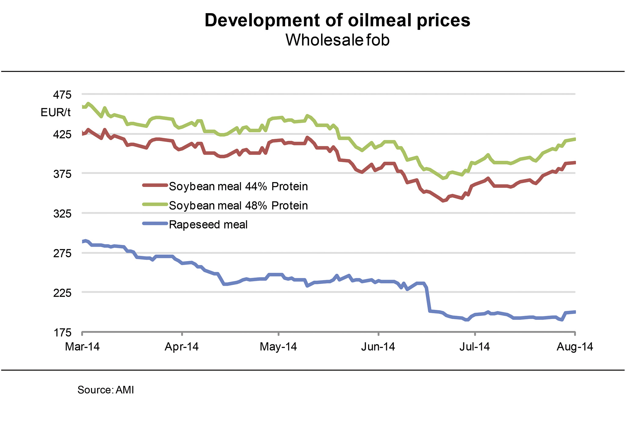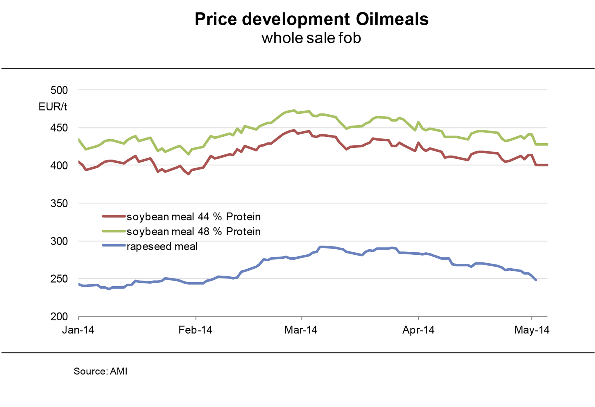 Prices for 44 % soybean meal rose from EUR 405 per tonne at the beginning of 2014 to EUR 435 per tonne in mid March. Since then they have trended downward to EUR 400 per tonne, down EUR 27 per tonne on the previous year. Asking prices for rapeseed meal were up just under 20 per cent by the end of March, reaching their preliminary 2014 peak at EUR 290 per tonne. They have been on a steady decline since, now standing at EUR 248 per tonne. This is EUR 64 per tonne down on the same time a year ago. Compared to the previous year, the price spread between these oilseed meals has widened by EUR 37 per tonne to EUR 152 per tonne. (AMI)