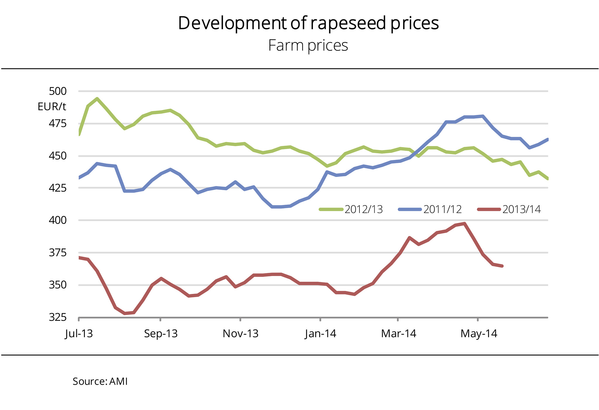 At the beginning of February 2014, farm prices of rapeseed climbed sharply. Most recently, buyers agreed to pay EUR 360 per tonne, EUR 12 per tonne more than earlier this month. However, the price gap against the previous year (EUR 93 per tonne) remains huge. Firm futures market quotations sent cash market prices rocketing. At the moment, soybean output in South America is at the centre of marketers' focus. Poor conditions there caused prices to increase. Moreover, the surprisingly large volume of US soybean exports is also supporting the price rise. In Germany, higher farm prices produced a short-term boom in supply. At the same time, rapeseed farmers showed more interest in marketing the 2014 crop, because contract prices also rallied. Given that the price climb in Paris ended abruptly, it is foreseeable that farm prices will soon be adjusted. (AMI)