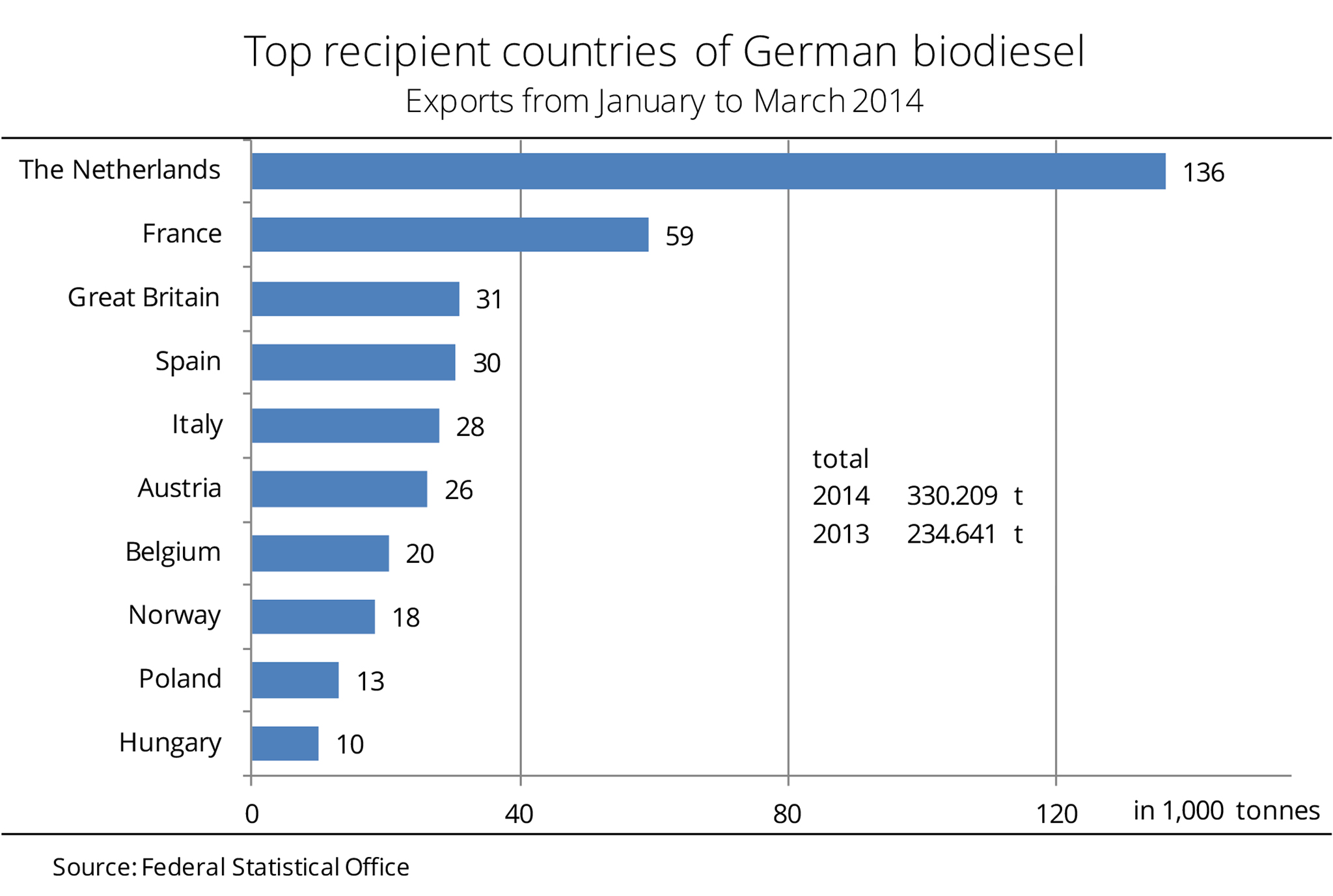 German biodiesel exports rose sharply in the first quarter of 2014, outstripping the long-term average by 60 per cent. At 398,000 tonnes, exports were up one fifth on the same period last year. The Netherlands received one third of total exports. This translates to a 30 per cent rise and leaves the country in first place. Exports to France, Spain and Norway rocketed by more than 100 per cent. Biodiesel exports to Spain shot up to 30,370 tonnes, from only 65 tonnes in the same period last year. France received twice this amount, advancing to second place. About 99 per cent of German biodiesel exports went to EU countries. By contrast, biodiesel exports to the US have nearly died down. They slumped to insignificant 6 tonnes, from more than 18,000 tonnes a year ago. New on the list of recipients is the aviation and shipping sector, which received 2,040 tonnes of biodiesel. (AMI)