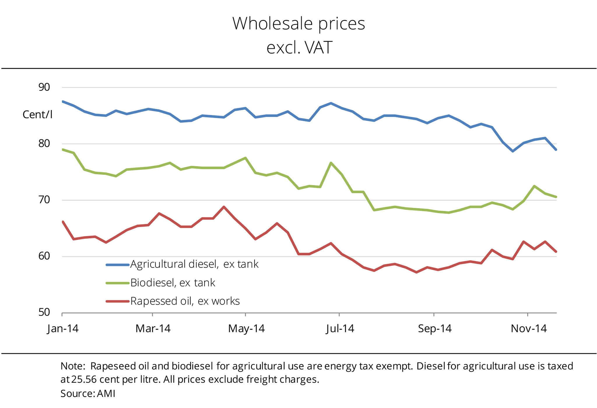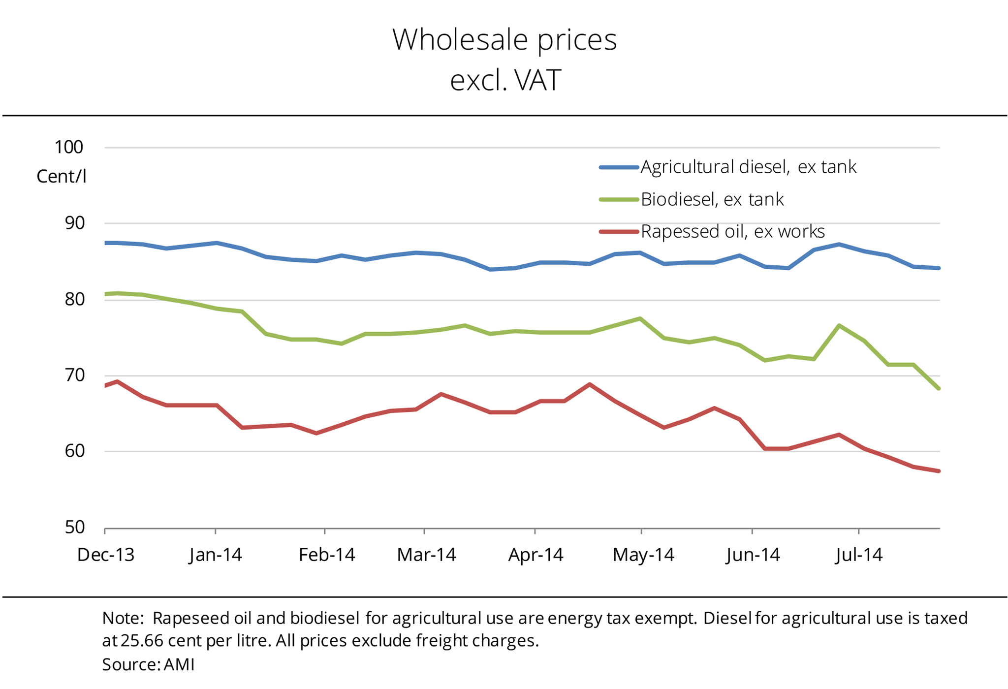 At the end of July 2014, the wholesale price for biodiesel stands at 68 euro cents per litre, around 16 cent below the price for agricultural diesel. Due to the massive drop in rapeseed prices in the wake of the harvest and with prospects for a convenient global oilseed supply in 2014/15, prices of rapeseed oil, and consequently also biodiesel, have recently plummeted. They plunged significantly more sharply than prices for agricultural diesel. As a result, the price spread between the two fuels has widened by 7 cent since the beginning of 2014 alone. Asking prices for rapeseed oil fell to the lowest level since 2010. The price for agricultural diesel hit its lowest level since the beginning of 2011. However, demand for biodiesel is fairly low at the moment, because traders are speculating for a continued decline in vegetable oil prices as the rapeseed harvest is in progress all across Germany. (AMI)