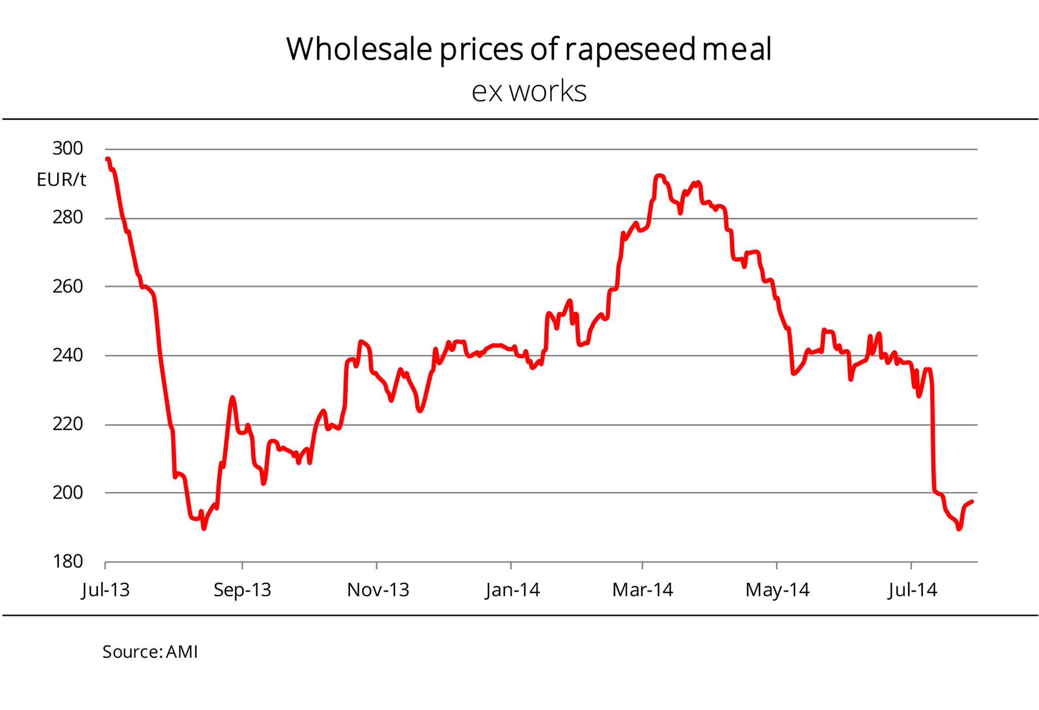 Following the beginning of the rapeseed harvest in the EU rapeseed producing countries in July 2014, a significantly larger supply of feedstock is now available to German processors. This beats down prices, which have dropped sharply, by nearly EUR 90 per tonne, since March. At the beginning of the year, the very tight supply of nearby material sent prices up. In the months that followed, spot commodity prices were largely determined by regional availability and demand. By contrast, prices asked for later positions were continuously adapted to the trends in Paris futures market quotations for rapeseed. Prospects of convenient feedstock supply in 2014/15 for some time led to massive price reductions. In July 2014, demand for rapeseed meal rose considerably as prices declined steadily. However, since nearby supply increases only slowly, asking prices have most recently been raised again. (AMI)