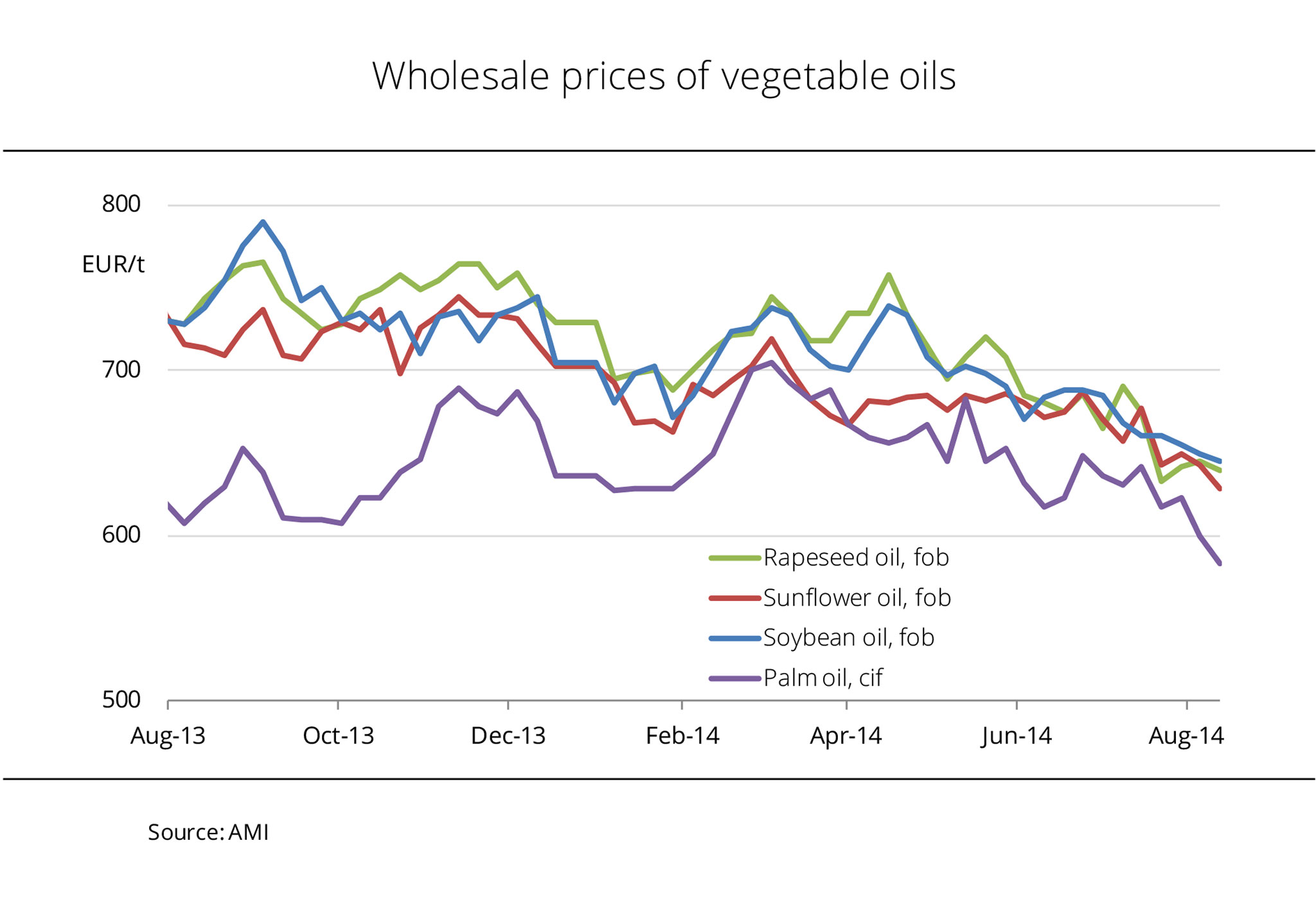 Wholesale prices for vegetable oils are on the decline. Above all, asking prices for palm oil were reduced sharply. As a result, the price spread between palm oil and the other vegetable oils has widened. In mid August 2014, palm oil cif North Sea harbours cost EUR 62 per tonne less than the competing soybean oil. The downward pressure on palm oil prices is due to declining futures market prices which slumped close to a five-year low in mid August. This slide was due to speculation about excess supply in Malaysia and increasing competition from other vegetable oils on the export market. At the same time, July palm oil production amounted to 1.67 million tonnes, up around 6 % from the previous month. Contrary to what market participants had expected, Malaysian stocks increased to 1.68 million tonnes at the end of July 2014, exceeding June figures by 2 %. Moreover, exports continue to fall short of expectations. The first twenty days of August saw a drop of just over 5 % from the same period in July, to 822,000 tonnes. (AMI)