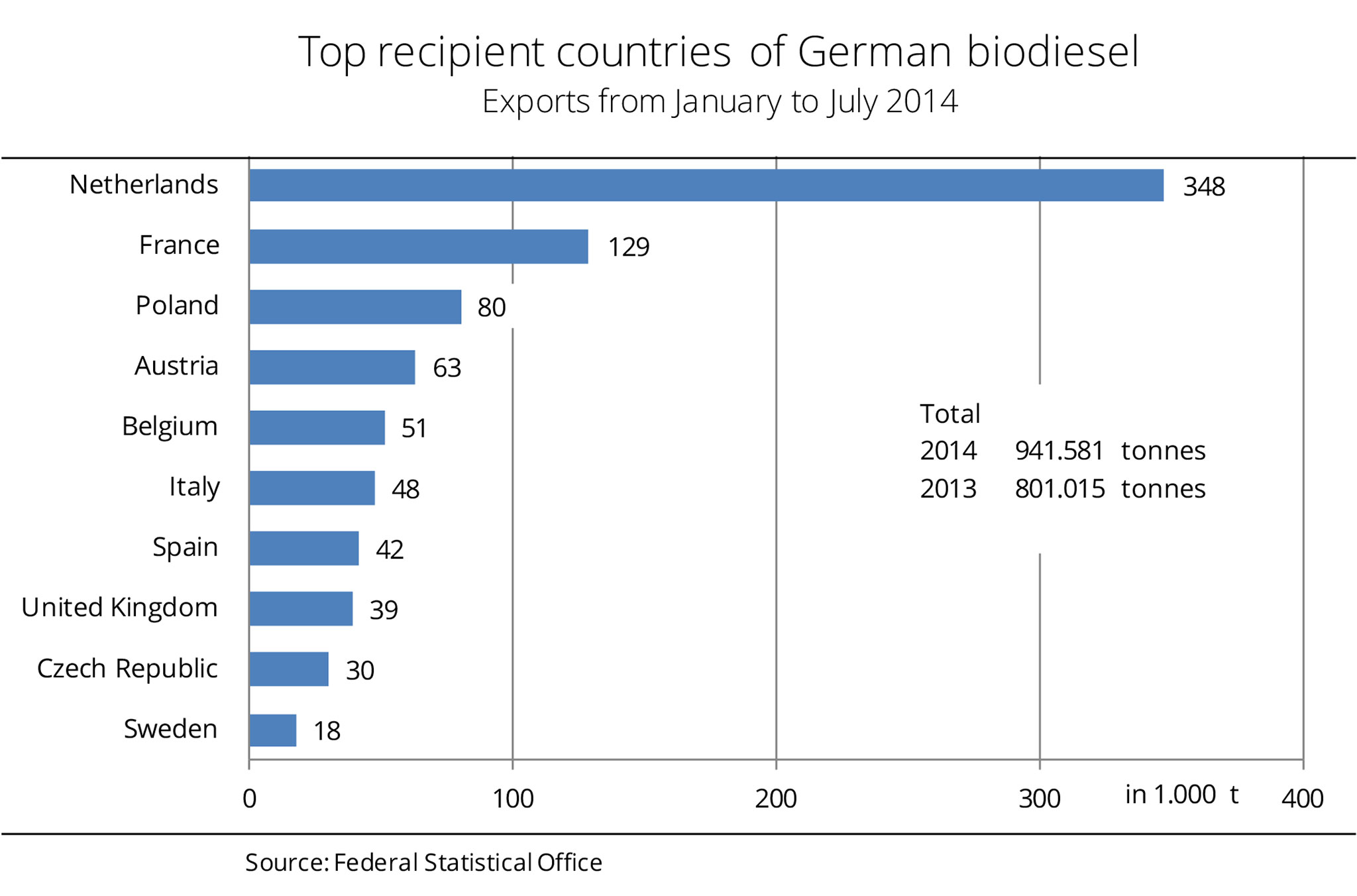 German biodiesel exports increased sharply over the first seven months of 2014. Totalling around 941,600 tonnes, biodiesel exports were up just under 18 per cent year-on-year. The Netherlands received more than one third of total exports. This translates to a 33 per cent rise and leaves the country in first place. Biodiesel exports to Spain shot up to 42,000 tonnes, from only 151 tonnes in the same period last year. Exports to France, Belgium and Sweden also rocketed, by 135, 68 and 29 per cent respectively. In other words, France secured second place again. Sweden, receiving 18,000 tonnes, ousted Hungary from tenth place on the list of top recipients. Between January and July 2014, EU countries absorbed around 94 per cent of German biodiesel exports. (AMI)