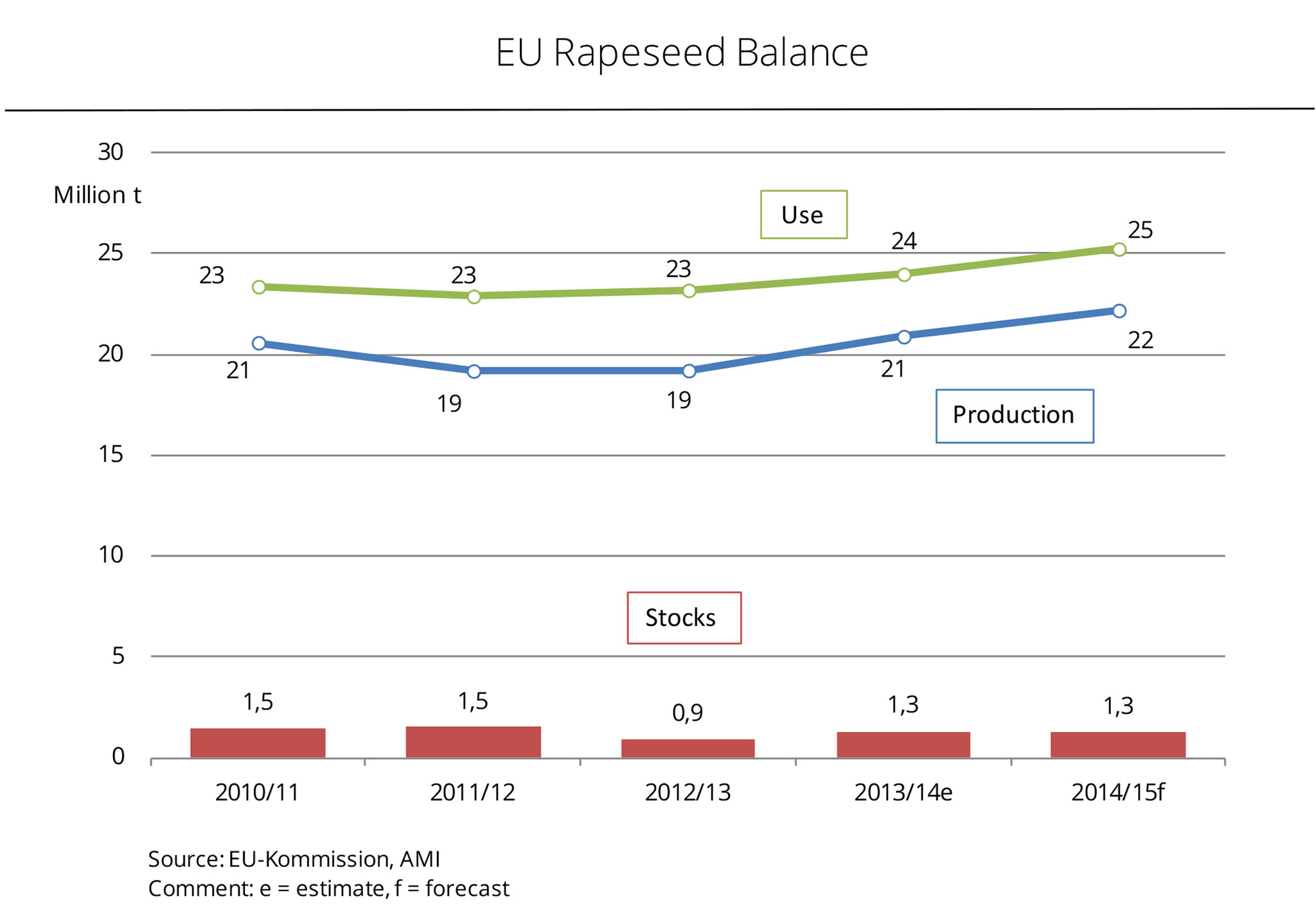 EU-28 rapeseed production in the 2014/15 marketing year is expected to exceed the previous year's output considerably. However, the EU Commission forecasts consumption to also rise sharply at the same time. Consequently, stocks of rapeseed in the stores at the end of the marketing year will presumably be virtually same as at the same time a year ago. At the end of 2013/14, ending stocks amounted to 1.3 million tonnes. The EU Commission currently forecasts total rapeseed production in 2014/15 at around 22.2 million tonnes, up just under 1.3 million tonnes from 2013/14. The chances are that supply will rise by just under 5 per cent, if imports are slightly reduced to