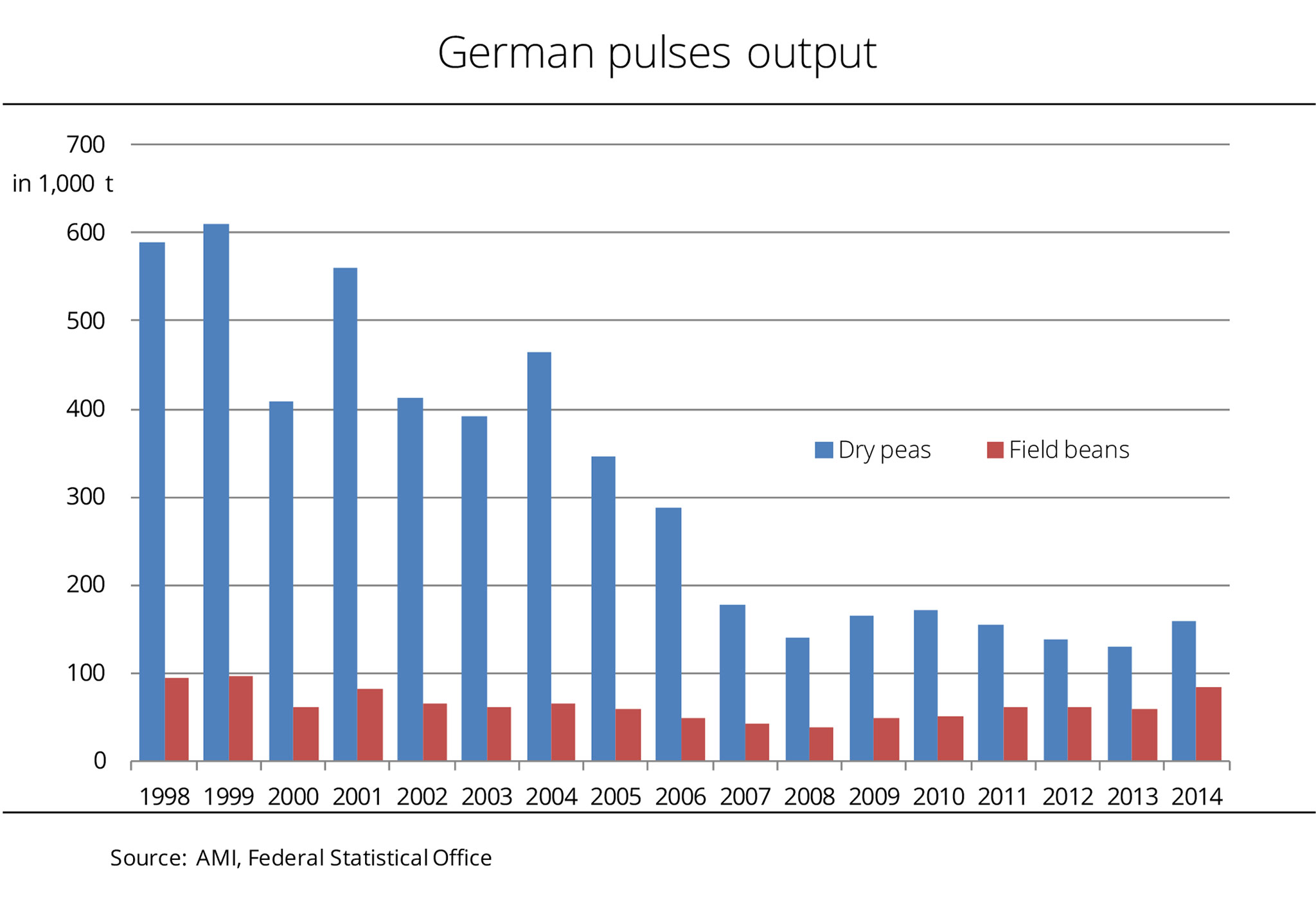 According to information published by the German Federal Statistical Office, German farmers harvested considerably more dry peas and field beans this year than last. At 158,000 tonnes, this year's dry pea crop exceeded the 2013 figure by 22 per cent. The main reasons were a substantial 13 per cent expansion of area, along with a 9 per cent increase in yield. The country saw the largest crop since 2010 when the harvest amounted to 172,000 tonnes. At 84,000 tonnes, the field bean crop was the largest in 15 years. The key factor driving up the harvest figure was the expansion of area. At 21,000 hectares, the area is estimated to have been up one third compared to the previous year. The increase in per-hectare yields also boosted harvest figures. German field bean yields averaged 40.9 decitonnes per hectare, outpacing the 2012/13 level by 13 per cent and even exceeding the long-term German mean by 14 per cent. Sweet lupine production in 2014 amounted to around 37,600 tonnes. This was up one fifth year-on-year. (AMI)