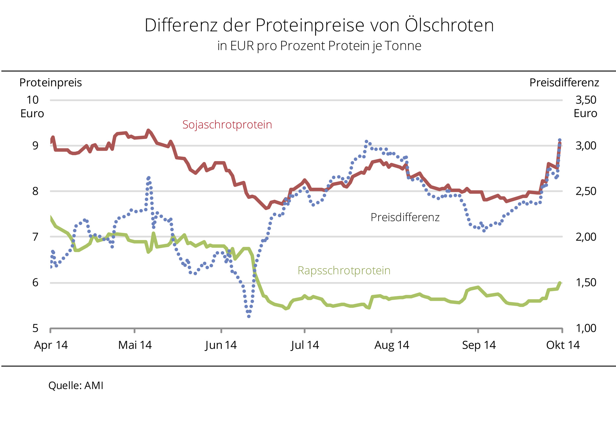 The protein price spread between soybean and rapeseed meal, calculated from the spot market price and protein content, hit a preliminary 2014 low at approximately EUR 1 in mid March, followed by a massive rise. In other words, rapeseed meal prices slumped between the end of April and mid May, whereas asking prices for soybean meal largely maintained their high level, based on scarce supply even early in the season. As a result, the spread between the theoretical rapeseed protein price and that of soy protein virtually doubled. Soybean meal prices have practically been in steady decline since June as futures quotes for soybeans and soybean meal are coming down. In contrast, asking prices for rapeseed meal are supported by tight nearby supply. Consequently, the difference in price between the two proteins has recently melted down to EUR 1.13 per tonne. (AMI)
