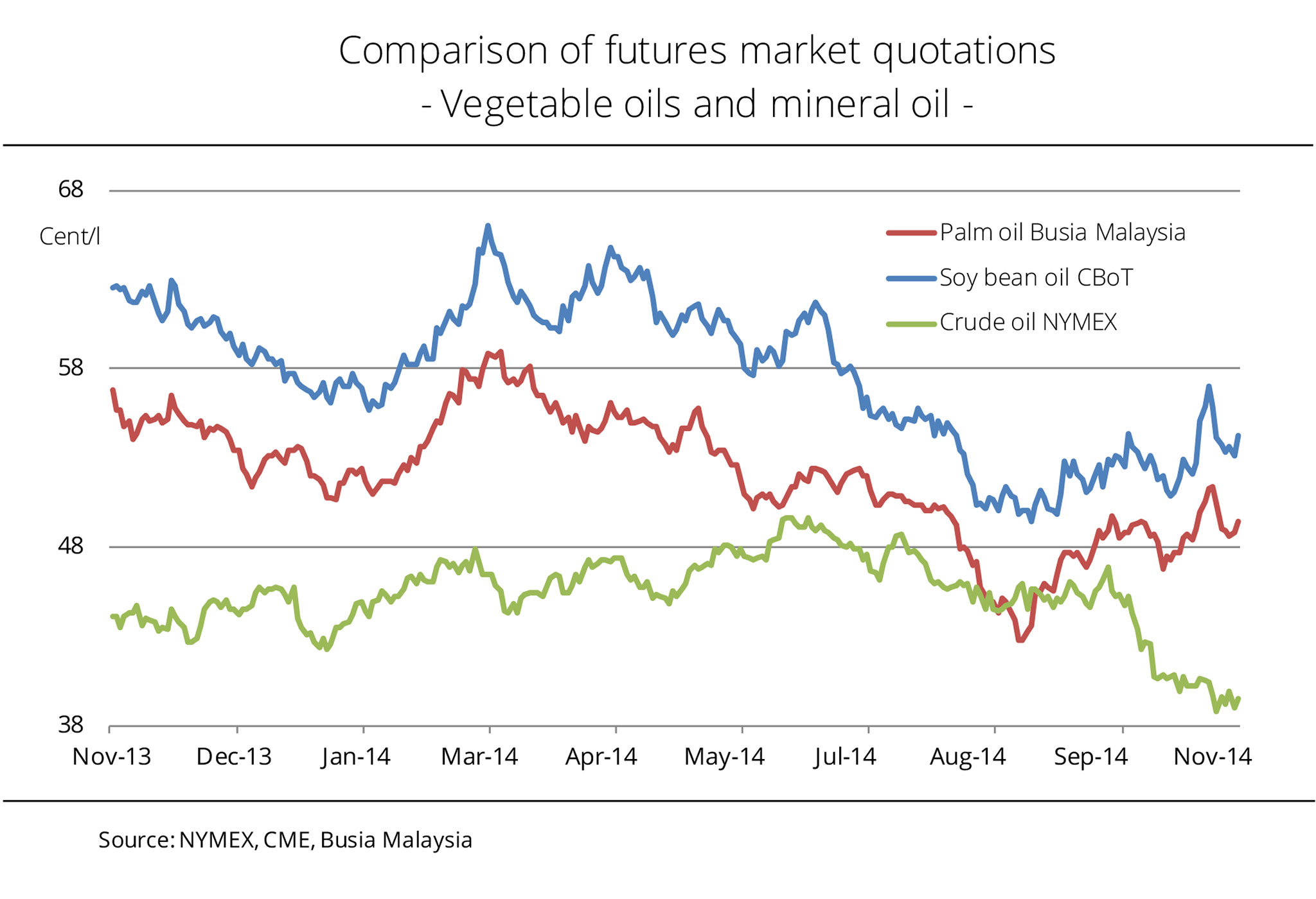 Trend in crude oil prices is distinct from price development for palm and soybean oil