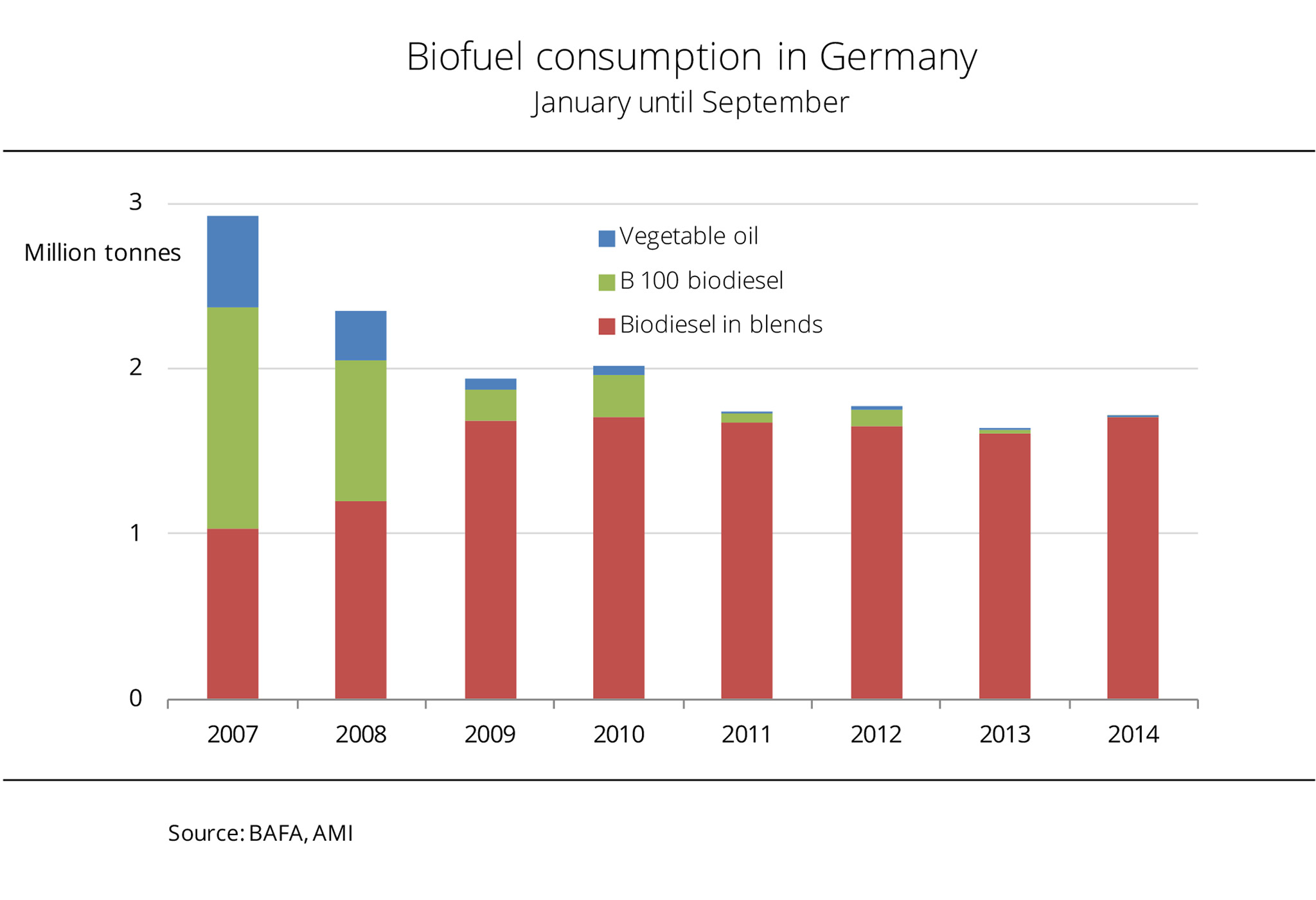 The use of biofuels has slightly risen over the year. Consumption of biodiesel from January to September 2014 amounted to around 1.7 million tonnes, up 6 per cent from the same period last year. The blending quota in the total quantity surged to 99 per cent, although B100 consumption rose slightly over the past few months. With monthly demand for B100 averaging 400 tonnes, B100 consumption is marginal compared to biodiesel use in blends (just about 190,000 tonnes per month) and even lower than the amount of vegetable oil consumed. The latter averaged 560 tonnes. Nevertheless, this was more than in 2013. The use of vegetable oil fuel virtually sextupled in 2014 compared to the previous year, to 5,000 tonnes. However, this figure cannot hide the fact that pure biofuels have lost importance over recent years. Seven years ago, consumption of vegetable oil and B100 still amounted to 1.9 million tonnes. (AMI)