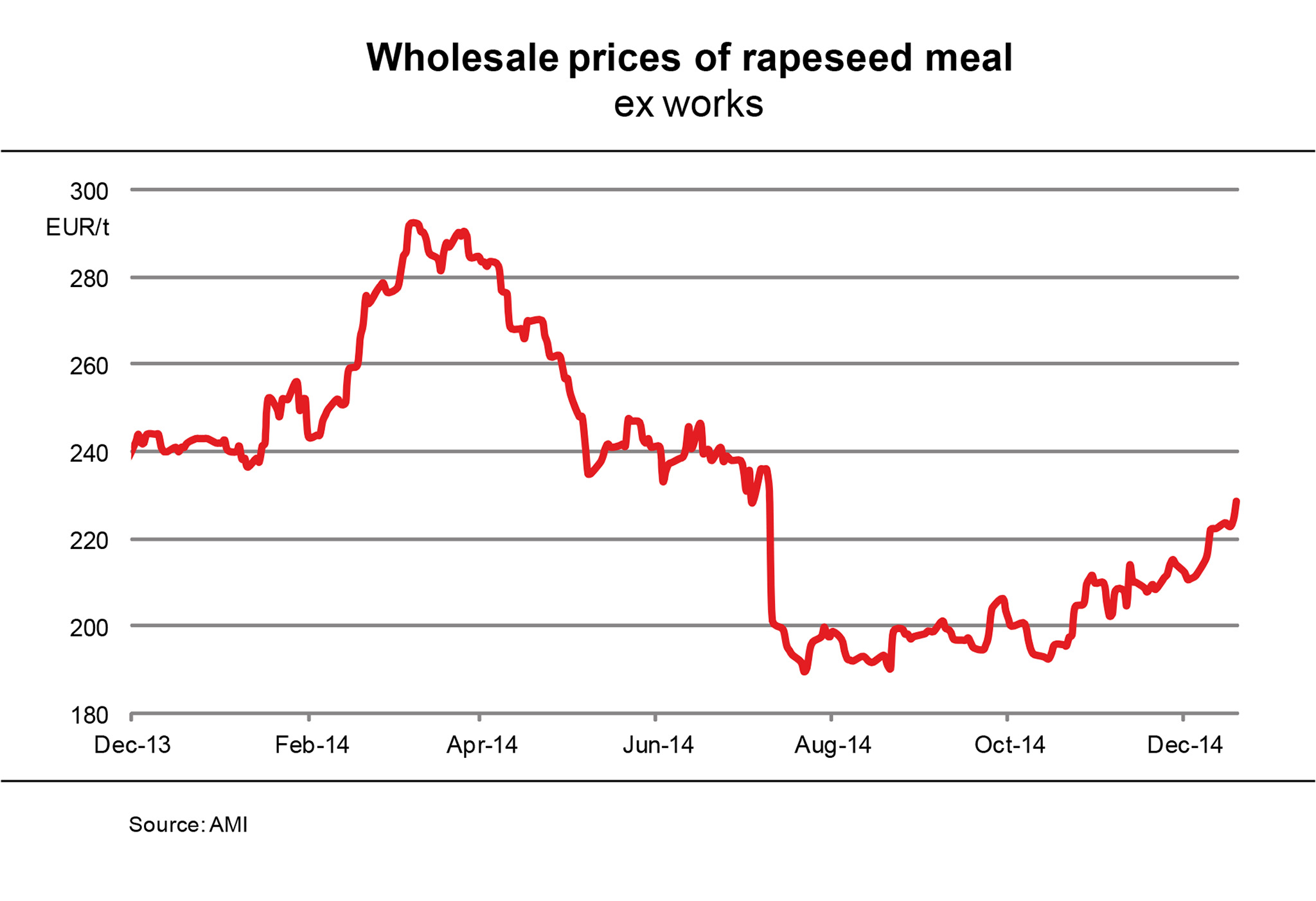 Although rapeseed meal prices are subject to strong fluctuations, the overall price trend is firm. Since reaching their annual low at just under EUR 190 per tonne at the end of August 2014, nearby supplies have surged by almost one fifth. However, this is still EUR 20 per tonne below the year-ago level. The upsurge in prices in recent months was driven by firm reference prices for feedstock in Paris and occasionally brisker demand. The reason for climbing demand was that as buyers feared rising prices they quickly stocked up to cover future need. Moreover, interest in this alternative source of protein was boosted by occasionally sharp rises in soybean meal prices. Meanwhile, supply of rapeseed meal is not large but adequate, because demand has recently been slow. Above all, prices for delivery at the end of the season climbed significantly in the wake of a reduced forecast of feedstock supply for the next year. (AMI)