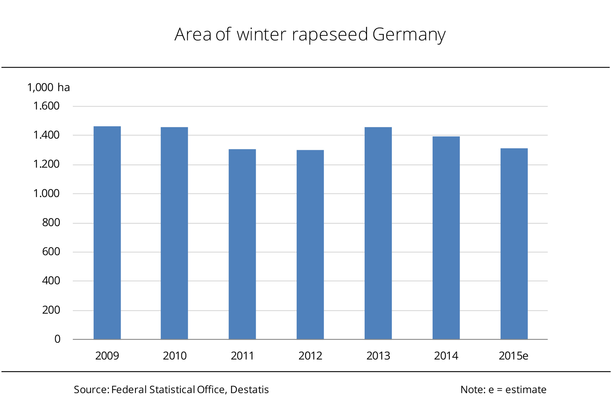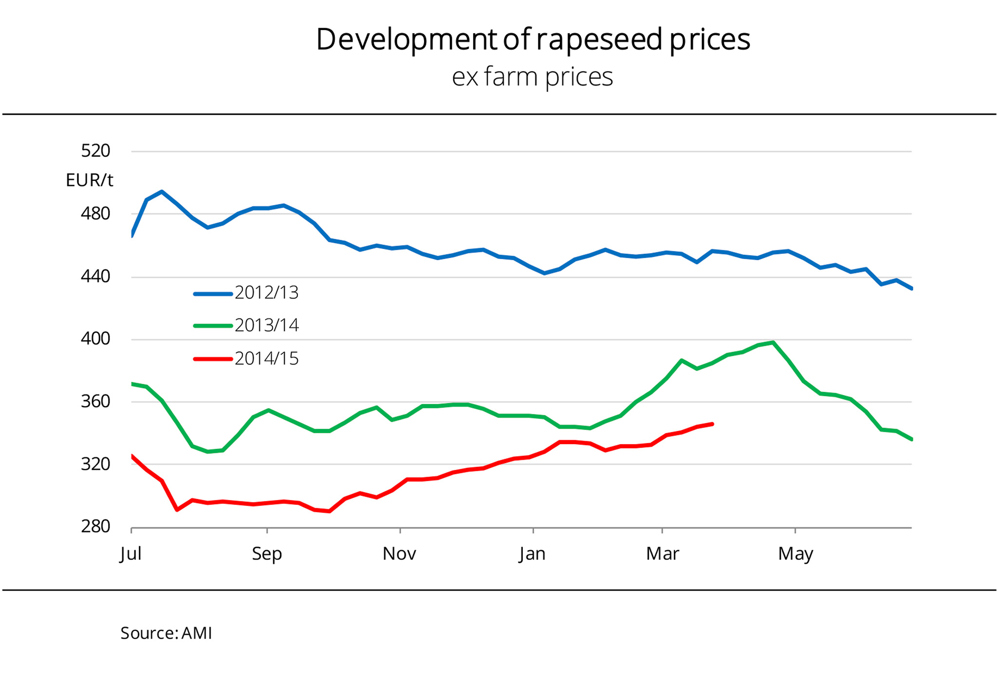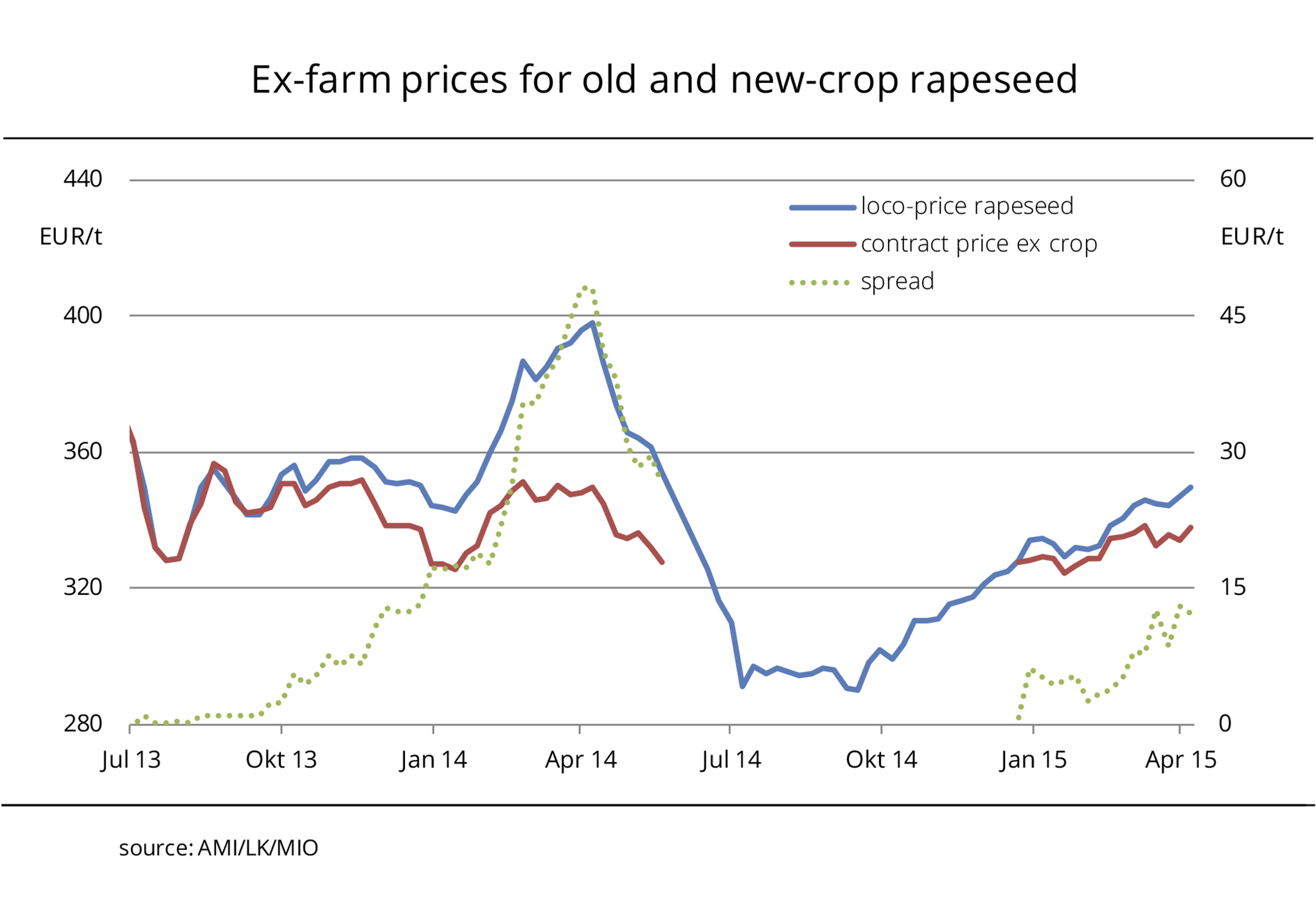 Farmers delay marketing of rapeseed for an unusually long time this marketing year. The key reason is that prices are significantly lower than they were in recent years. In the wake of the large 2014 rapeseed crop in Germany and the bumper crop in the EU-28, prices made a weak start to the new season. Farm prices have risen sharply over the past several months. The surge was primarily fuelled by very tight supply on the cash market and recently underpinned by prospects for a significant drop in rapeseed production in 2015. Despite the rise, the current average ex farm price of EUR 350 per tonne hardly lures producers to sell stock. The 2015 crop is also rarely a topic of conversation. Not even one fifth of the estimated 5.3 million tonnes (this figure would be 18 per cent down from the previous year) was contracted by April 2015. This is a record low. (AMI)