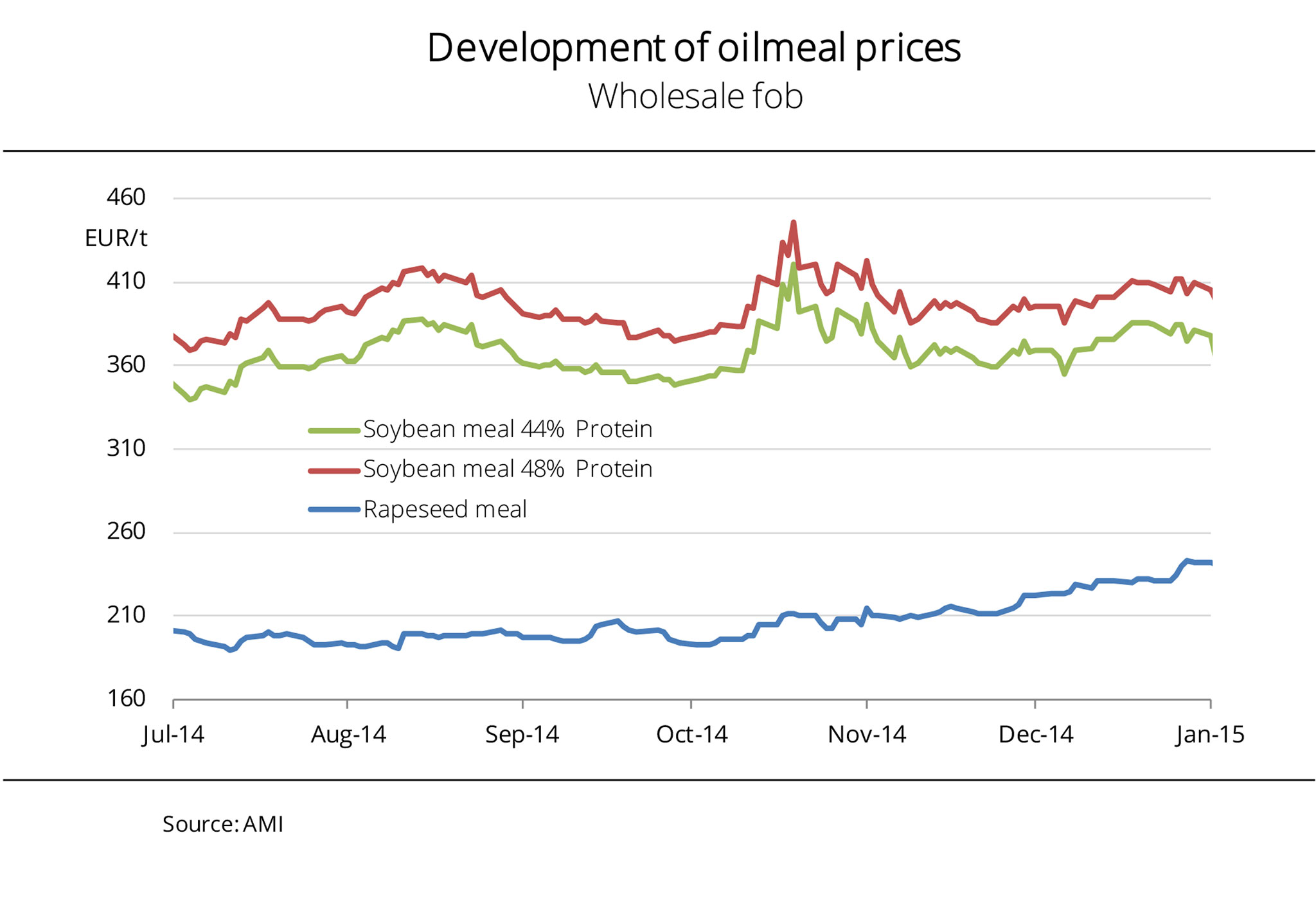 The oil meal market has not yet kicked into gear in 2015. Whereas the soybean meal business primarily lacks supply, trade in rapeseed meal is paralysed by very scant demand. Due to the massive price rise, demand decreased to virtually nil over the past few weeks. In mid January 2015, rapeseed meal for prompt delivery stands at EUR 242 per tonne fob oil mill, a price not seen since June 2014. Prices have rallied by nearly EUR 30 per tonne since the beginning of December 2014 alone. The surge even put off buyers who had absolute need after the turn of the year. However, they were not many. The key reason for the sharp price increases was the firm trend of Paris feedstock prices. (AMI)
