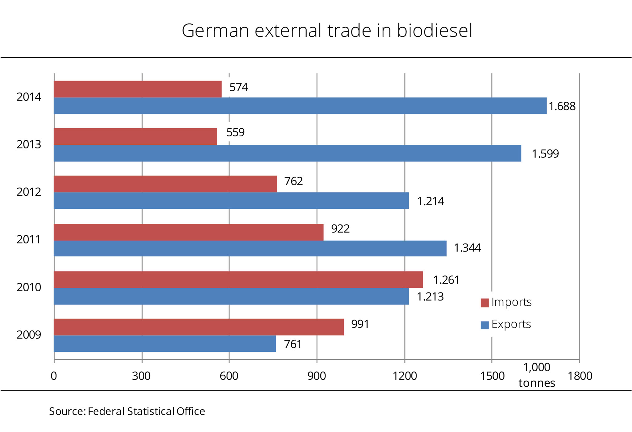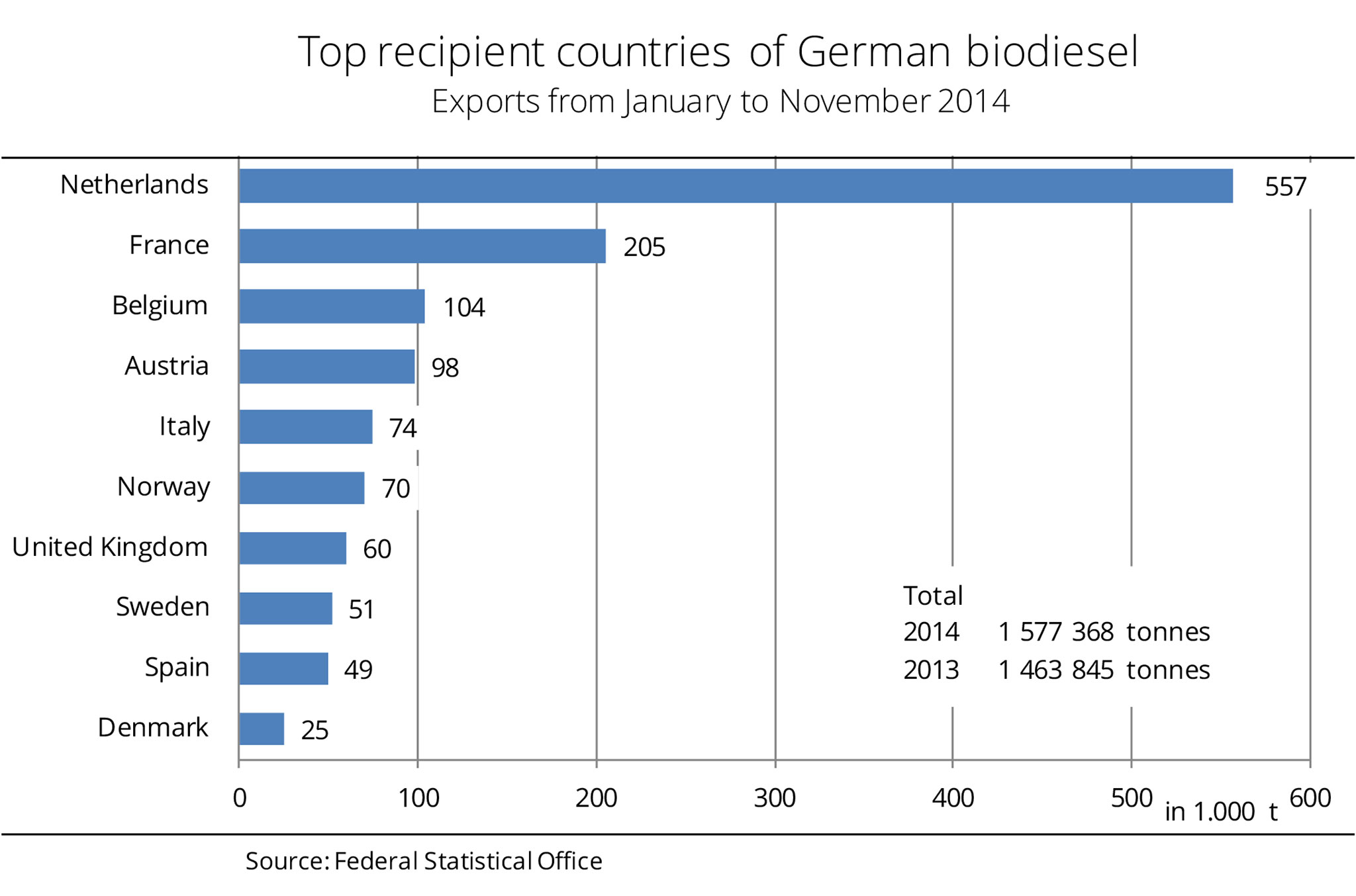 German Biodiesel exports surged in 2014, but less so than in 2013. The increase from the previous year amounted to just under 6 per cent. In 2013, exports rallied by nearly one fifth from 2012. In other words, the upward trend (with the exception of 2012) continues. Other EU countries were still the main recipients in 2014, headed by the Netherlands. At a record amount of nearly 599,100 tonnes, the Netherlands alone absorbed 35 per cent of total German deliveries to the EU. This translates to a 19 per cent increase from 2013. France took second place, absorbing twice the amount of 2013 (221,600 tonnes). Consequently, Poland (143,100 tonnes) was relegated to third position. The country's imports dropped by approximately one fifth from the previous year. Norway was the number one export partner outside the EU-28. German biodiesel imports surged slightly in 2014, ending their downward slide. A significant rise from 2013 was seen in imports from France, Italy and Austria, among other countries. (AMI)