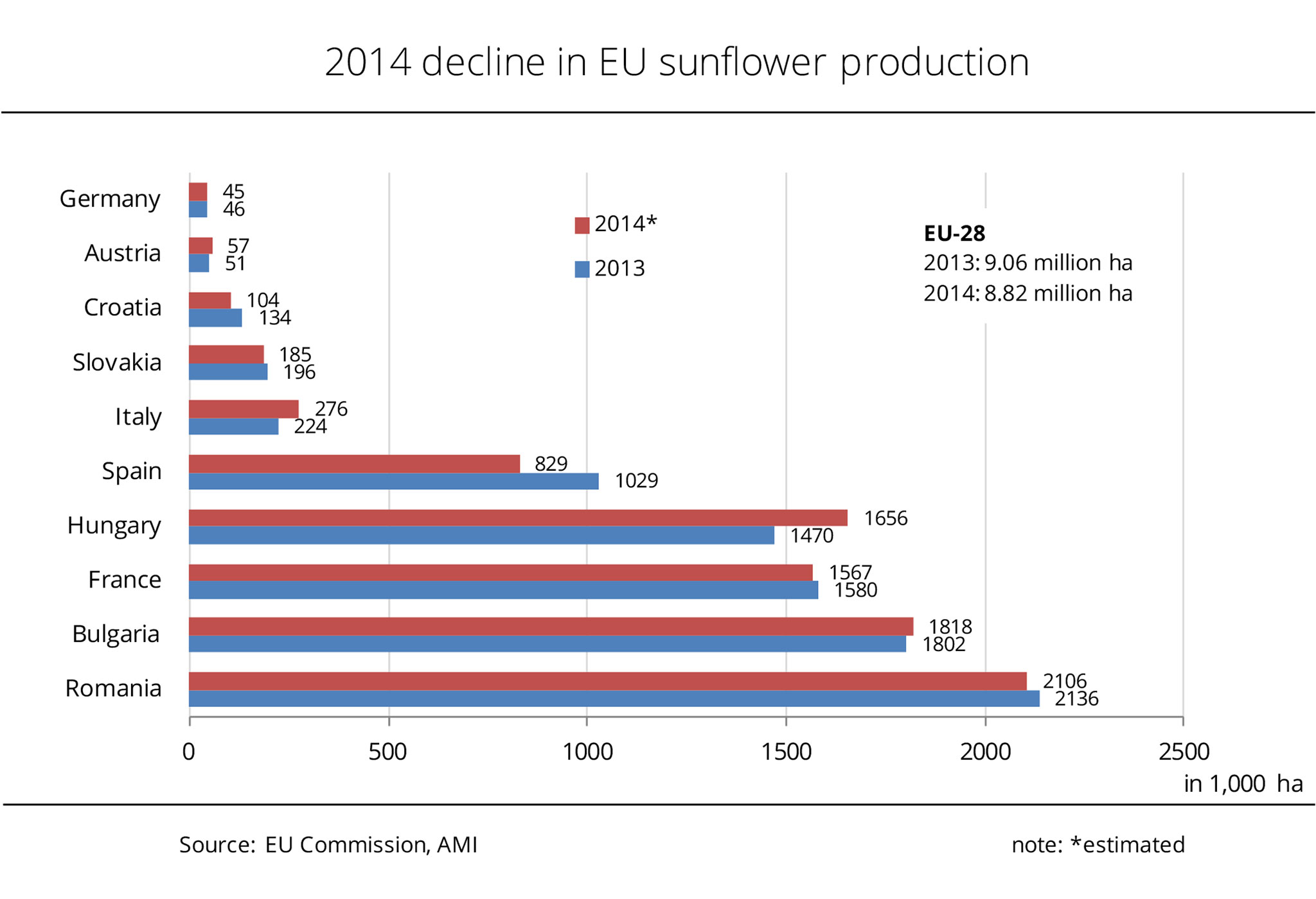 After the large 2013 crop with very unsatisfactory prices, some EU farmers cut sunflower production sharply in 2014. The EU Commission puts the shrinkage in area across the EU at nearly 8 per cent, to about 4.2 million hectares. However, yields were significantly better than expected, even outpacing the previous year's figures. At 21 decitonnes per hectare, yields were up just under one decitonne per hectare. Austria had the highest yields at 28 decitonnes per hectare, followed by Hungary at 27 decitonnes per hectare and Croatia at 26 decitonnes per hectare. Yields in Spain were by far lowest. Due to poor weather conditions during the crop cycle, they were at only 10 decitonnes per hectare. This drop is also reflected in the harvest figures. At 839,000 tonnes, the harvest was down one fourth from the previous year. The total EU crop amounted to 8.8 million tonnes, a slide of just under 3 per cent from 2013. (AMI)