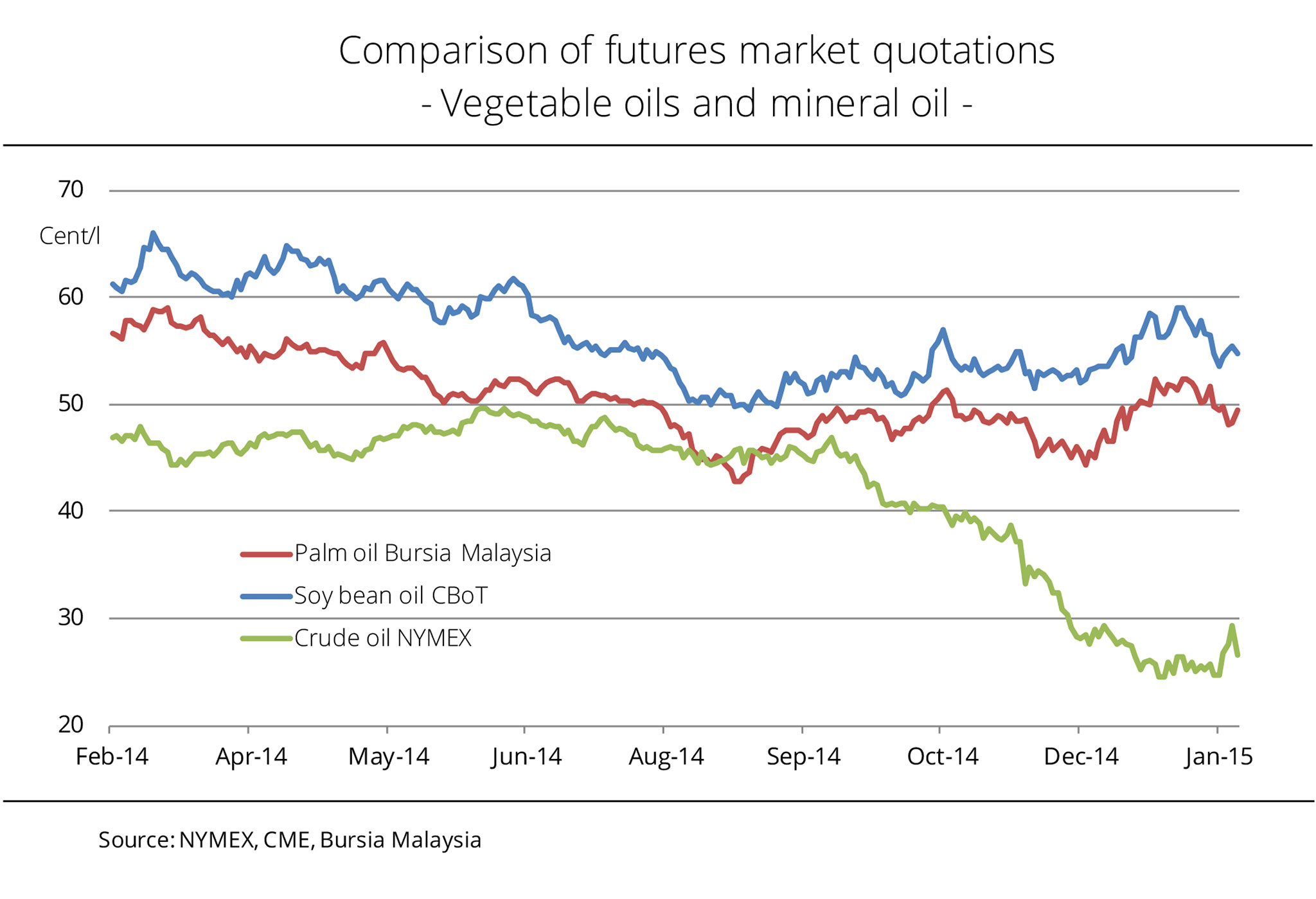 Vegetable oil prices dropped - in some cases sharply - at the end of February 2015. The slide was driven by falling mineral oil prices and scant demand. Mineral oil traded on the NYMEX continued its downward trend as supply exceeded demand. As a result, the nearby slid below the mark of USD 50 per barrel for some time. In the wake of weak reference prices on the futures markets, vegetable oil prices were reduced considerably on the European cash market at the end of February. However, demand has not been generated, because buyers still find current prices hardly financially appealing. Sales of rapeseed oil continue sluggish because falling mineral oil prices reduce the competitive advantage of biodiesel and, consequently, the interest in feedstock. Rapeseed oil currently stands at EUR 657.50 per tonne fob Hamburg, EUR 20 per tonne below the level of soybean oil. At EUR 696 per tonne, sunflower oil continues to be the most expensive vegetable oil. (AMI)