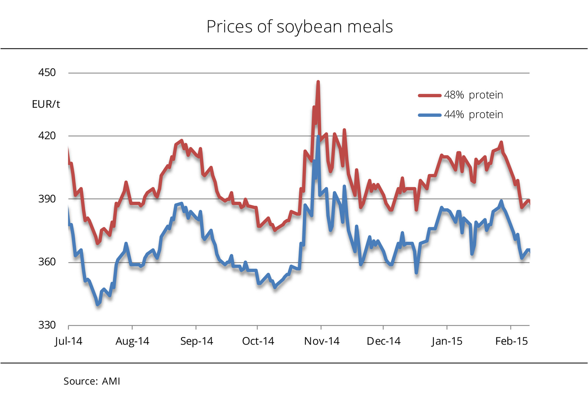 Due to scarce nearby supply, prices of soybean meal remained unaffected by the slump in Chicago reference prices for feedstock for a long time. However, over the past few days they dropped massively. The plunge was driven by weak reference prices for US soybean meal and scant demand on the cash market. In view of ample supply from South America, the trend is bound to continue weak over the long term. Since the first export shipments were loaded in Brazilian ports at the end of January 2015, prices for spot material have dwindled by just under EUR 15 per tonne, hitting a two-month low. Trade in soybean meal is currently very sluggish because compound feed manufacturers are stocked up well and only occasionally buy small quantities. In the light of this, not even falling prices will generate demand. (AMI)