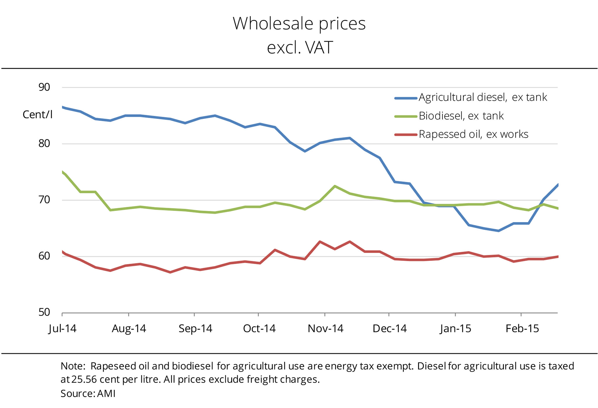 The gap between wholesale prices for biodiesel and agricultural diesel has widened considerably over the past few weeks. By contrast, rapeseed oil and agricultural diesel are at virtually the same level.