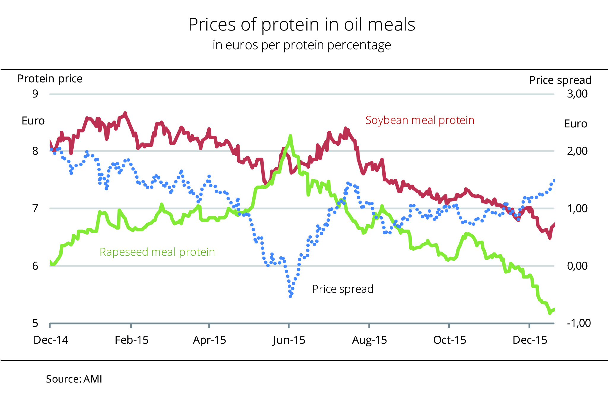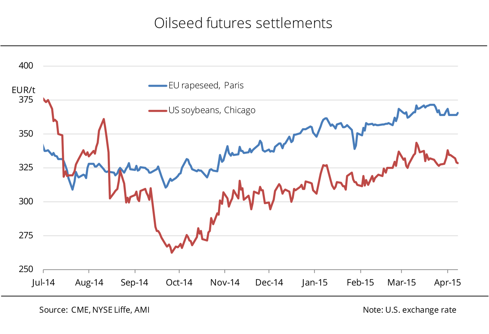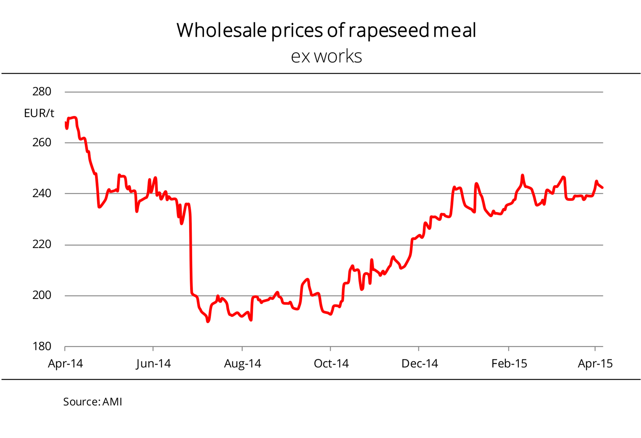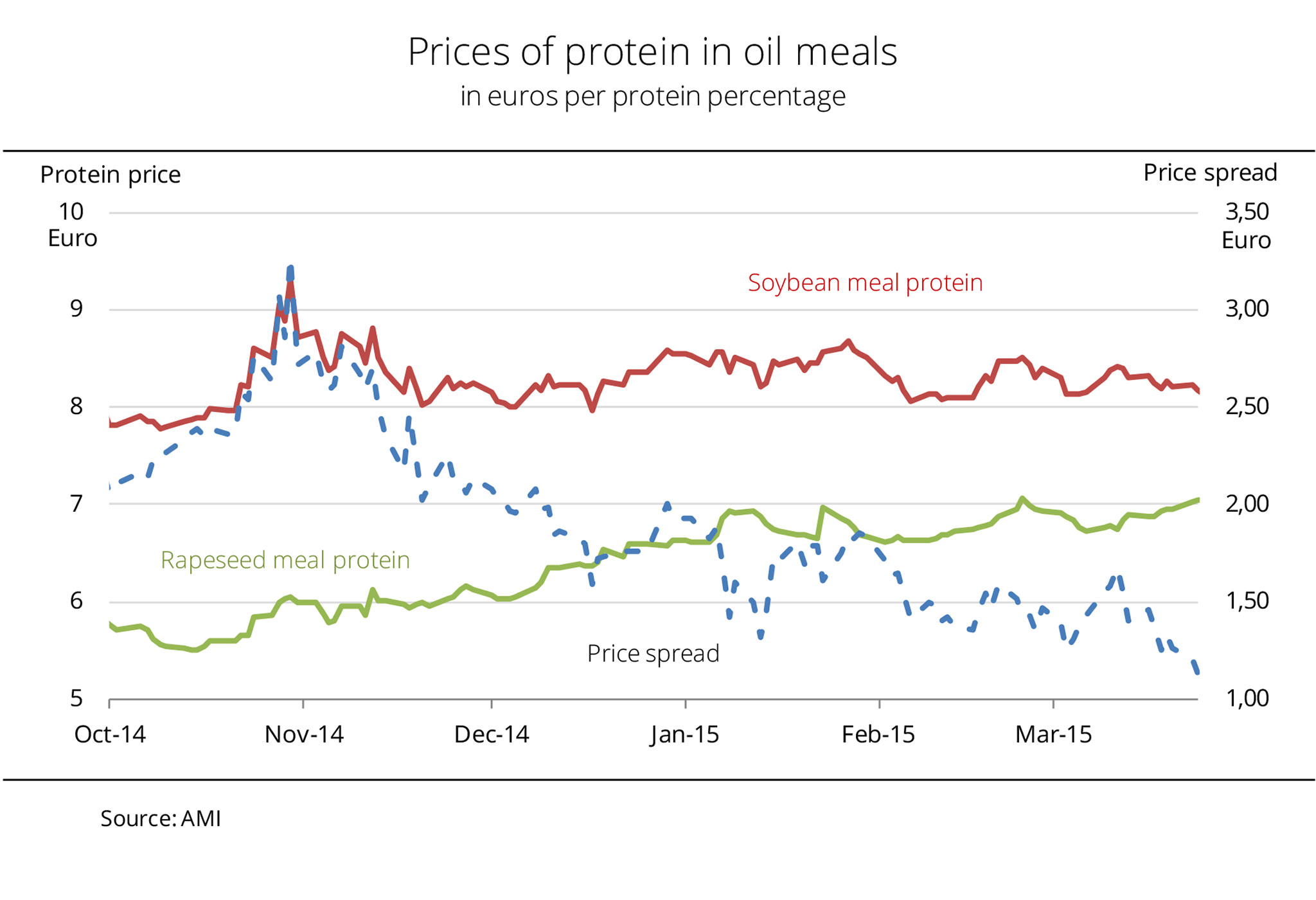 Prices for soybean and rapeseed meal proteins have converged over the past few months, but continue to vary significantly. This especially applies to soybean meal, because asking prices are adjusted on a daily basis depending on the trend in soybean and soybean meal prices. At the end of March 2015, the spread between soybean and rapeseed meal protein prices, calculated from the spot market price and protein content, amounted to EUR 1.20. This was the lowest level since July 2014. Whereas rapeseed meal protein approached the mark of EUR 7 per protein percentage per tonne on firming rapeseed reference prices in Paris and more vivid demand, prices of soybean meal protein varied between EUR 8.10-8.40 at the end of March 2015. Meanwhile, the cash market for oilseed meal is very slow. Nearby supply, especially of soybean meal, is very moderate. At the same time, demand is slack also, because buyers are stocked up well. (AMI)