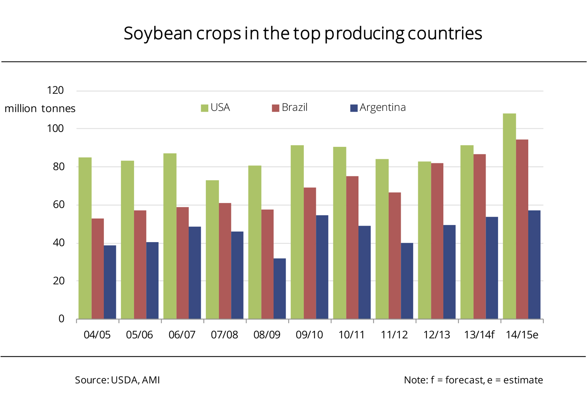 Soybean supply in the 2014/15 marketing year has been very convenient. In the US alone, final stocks will be four times the previous year’s quantity. The worldwide surge is expected to amount to 35 per cent. The key reason is the bumper crops in the top soy producing countries US, Argentina and Brazil. Whereas the US soybean harvest for the 2014/15 period was already brought in in the summer of 2014, harvesting in South America is in full swing now. In the wake of expansions in area planted and favourable growing and harvesting conditions, crop yields are at record levels this season too. The forecast for Argentina was recently even raised by one million tonnes, to 57 million tonnes. Supplies in Brazil are projected at 94.5 million tonnes. Stiff competition is giving US Americans a rough time in the export business. The explanation is that the strong dollar has appreciably reduced the competitiveness of US soybeans. Futures prices respond to this change with a decline. (AMI)