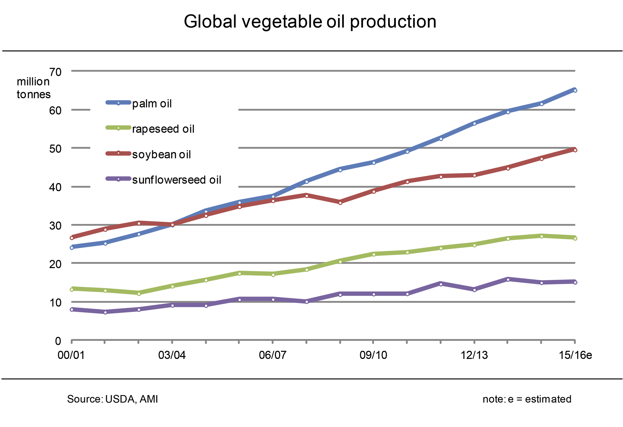 The USDA estimates the world's production of vegetable oils in the 2015/16 marketing year at 181 million tonnes, up 5 million tonnes year-on-year. Palm, soybean, rapeseed and sunflower oil account for the lion's share. Whereas soybean and palm oil continue their upward trends, production of rapeseed and sunflower oil is on the decline. The reason is that availability of feedstock is much tighter than a year earlier. The drop in rapeseed oil production is forecast to be sharpest, down around 4 per cent from the previous year. Consequently, the increase that has been happening since 2006/07 would have come to a halt. 2015/16 output of sunflower oil is down just over 1 per cent from the previous year, hitting a three-year low. Palm oil saw the largest growth, by just under 6 per cent, increasing its lead in output. Fears that El Niño could affect crop output have not been confirmed to date. Soybean production is estimated to rise by 5 per cent to a seven-year high. (AMI)