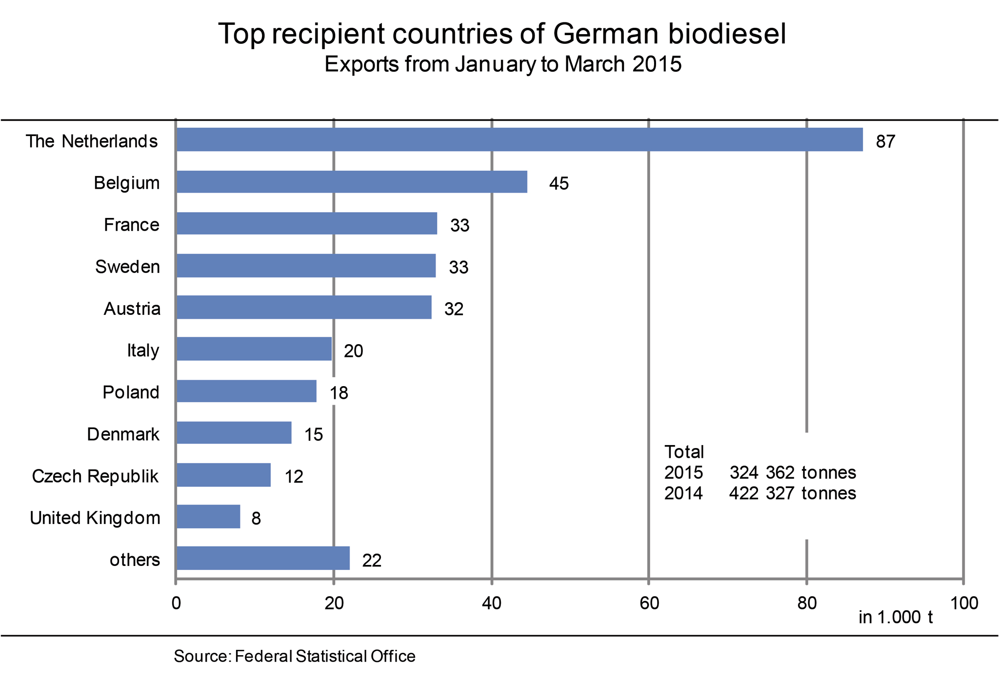 German biodiesel exports saw a massive decline in the first quarter of 2015, dropping to around 324,000 tonnes, virtually one fifth below the year-ago level. However, the figure outpaced the long-term average by just under 5 per cent. The Netherlands received approximately one fourth of total exports. Consequently, despite a sharp 45 per cent slump in imports from the same period last year, the country continued to be the main importer. The biggest growth was seen in Sweden. The country absorbed approximately 33,000 tonnes in the first quarter, compared to only 143 tonnes in the same period last year. The German Federal Statistical Office also recorded a substantial rise for Belgium and Denmark. By contrast, France imported significantly less and barely continued on third place, with Austria fourth. Around 97 per cent of German biodiesel exports went to other EU countries. Norway was again the principal recipient country outside the EU. (AMI)