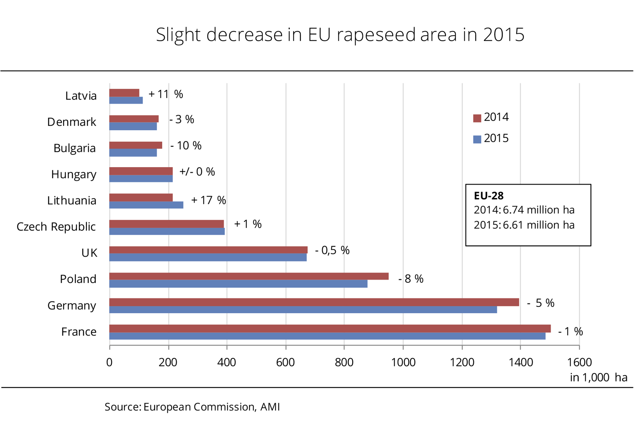 Experts expect a reduction of EU rapeseed area for the 2015 harvest compared to the previous year. The area devoted to growing rapeseed in the EU-28 is estimated at 6.54 million hectares, down 224,000 ha from the 2014 figure. All of the member states are seeing a decline in area. At the same time, in most cases winter rapeseed crops are in good condition. The key reason is the mild winter which hardly caused any plant damage. However, insect and disease pressure will be higher than in previous years. EU farmers will most probably not see last year's record harvest figures in 2015. First vague harvest estimates put the 2105 EU rapeseed crop at 21-21.4 million tonnes. This translates to an up to 12 per cent drop from 2014. (AMI)