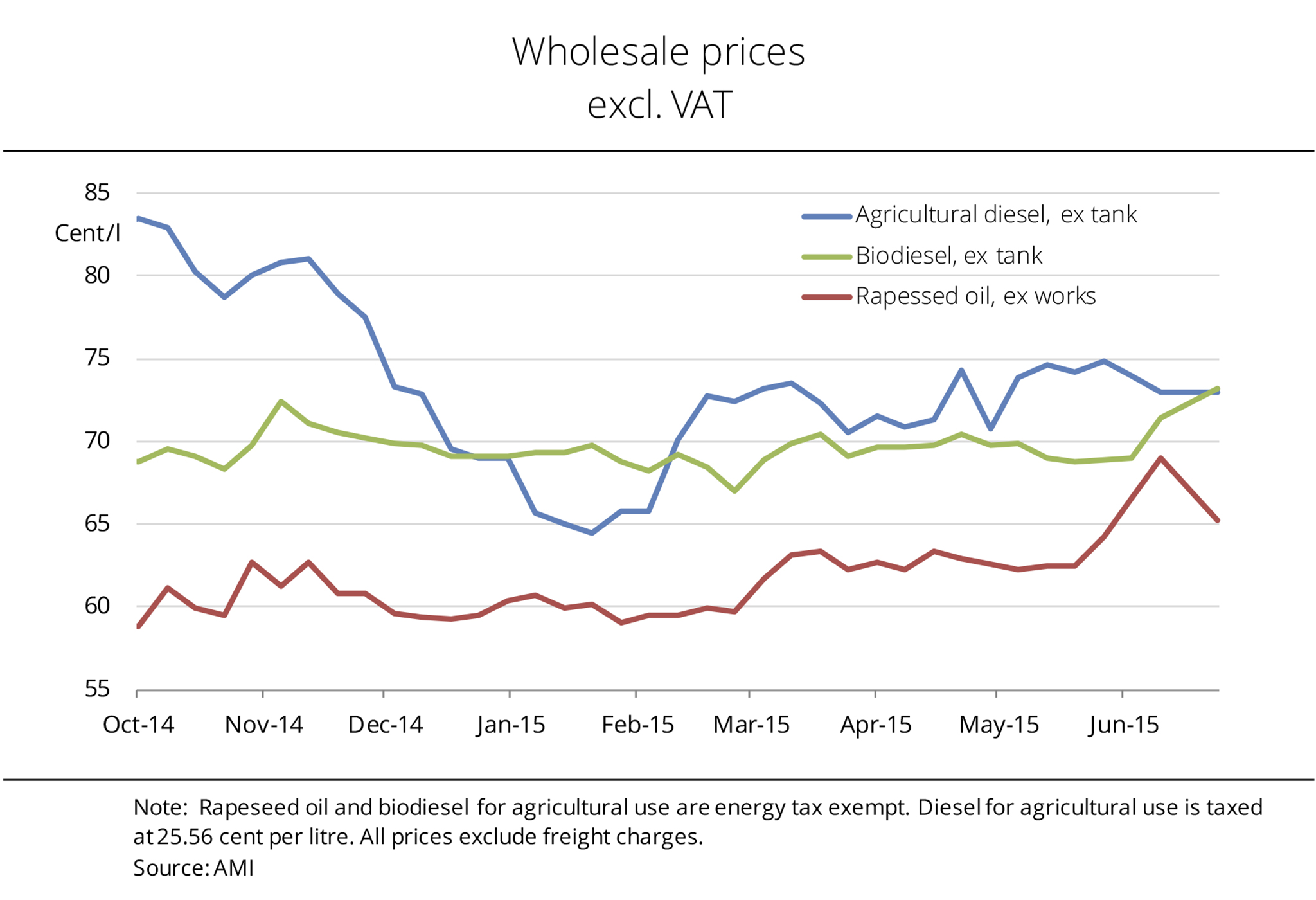 Wholesale prices for biodiesel and agricultural diesel have recently converged rapidly. At the end of June 2015, asking prices for biodiesel outpaced those for agricultural diesel for the first time in 19 weeks. With biodiesel standing at around 73 euro cents per litre, it has lost a great deal of its competitiveness. The sharp rise in biodiesel prices was due to the massive increase in prices of vegetable oils. In other words, asking prices for very scarce rapeseed oil surged by almost 10 per cent in four weeks, to the highest level in almost two years. This put a noticeable damper on demand. Nevertheless, rapeseed oil and also rapeseed oil raffinate for July 2015 delivery is practically sold out. Nearby offers are not available until August and already reflect the new rapeseed crop. These conditions explain the sharp peak. In the wake of the scarcity of feedstock and seasonal maintenance downtime of oil mills, rapeseed oil will continue to be in short supply in the coming weeks. (AMI)