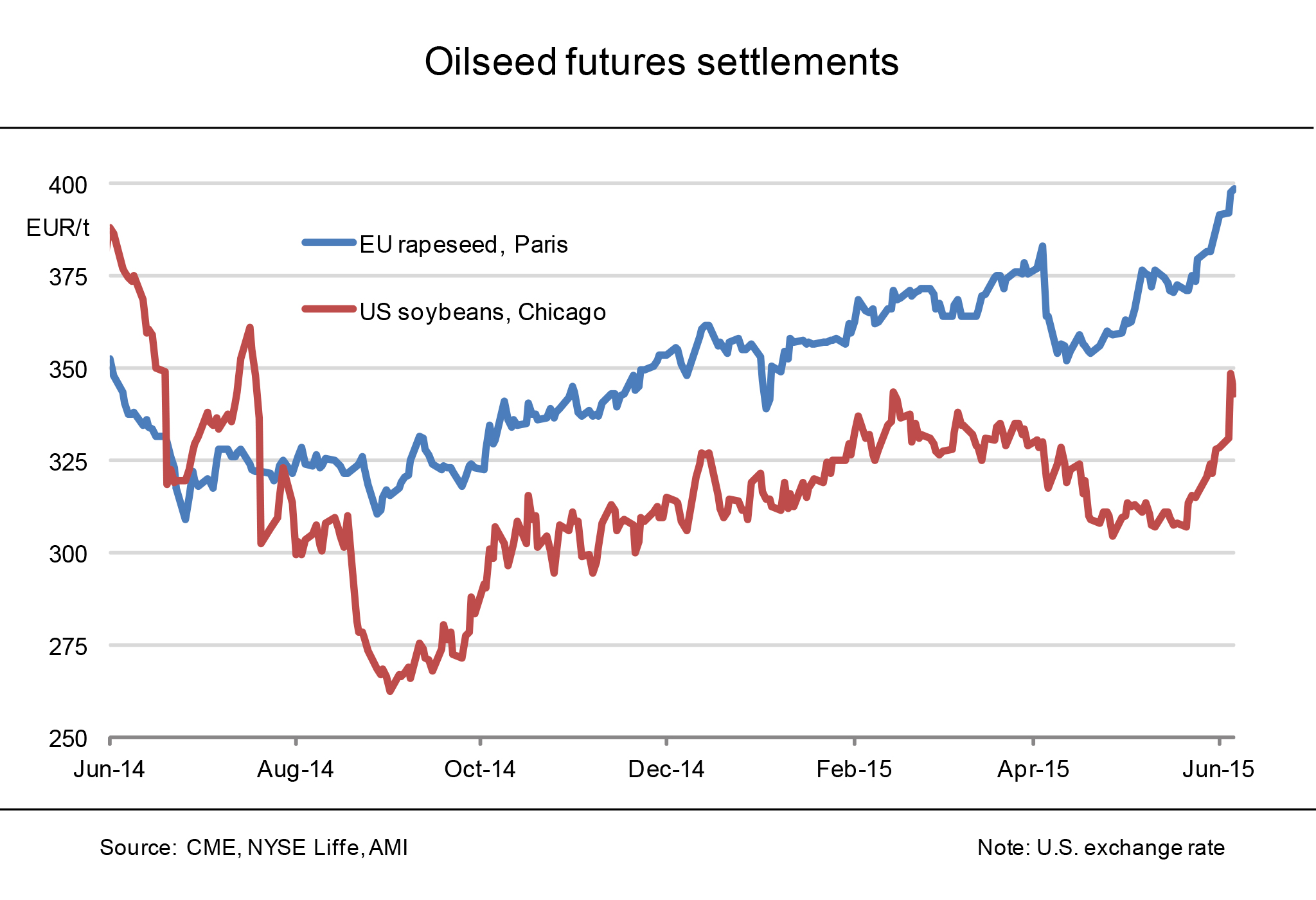 Oilseed prices rose considerably over the past few weeks. Whereas rapeseed in Paris hit the highest level since April 2014, soy climbed to a six-month high in Chicago. The reason for the massive surge in prices for rapeseed (the nearby shot up by virtually 13 per cent since April 2015) is the pessimistic outlook for the 2015 rapeseed crop. In other words, crop expectations have dipped in the wake of protracted drought during the crop cycle which, in addition to the reduced rapeseed area, might push the output of rapeseed even below the previously expected level. Coceral (the European grain and oilseed traders' association) forecasts EU rapeseed production at 21.4 million tonnes. This would translate to an 11 per cent drop from the previous year. In Southeast Europe, this year's harvest has already started. No initial yield figures have been identified to date. In the meantime, planting of soybeans is still ongoing in the US after being delayed by strong rains. Soybean prices are on a firm trend as demand for US soy is buoyant. (AMI)