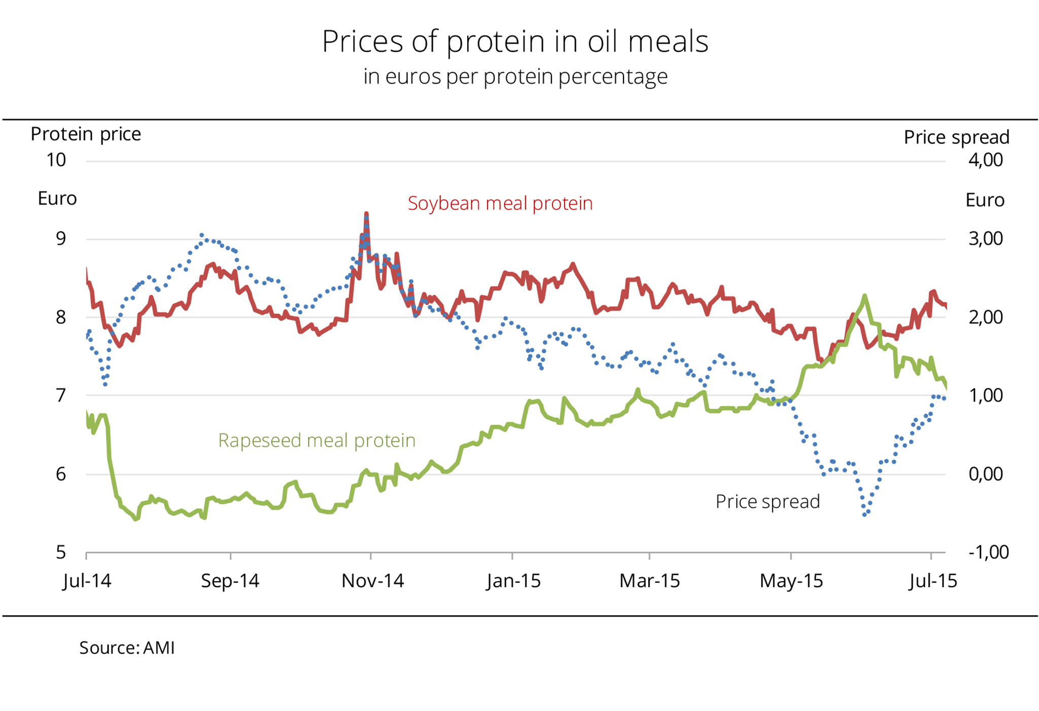Over the past few months, the difference between prices for rapeseed and soybean meal protein hovered around the level of EUR 1 per protein percentage per tonne. This translates to a 50 per cent drop from a year earlier. Rapeseed meal in particular lost its edge, because its protein prices converged with those for soybean meal protein, Agrarmarkt Informations-Gesellschaft mbH (AMI) reports. At EUR 8.14 per protein percentage at the beginning of June 2015, rapeseed meal protein temporarily even topped soybean meal protein by 25 euro cents. Demand did not pick up, although protein prices dropped substantially in the wake of superabundant supply over the past few months, in some cases hitting lows. In other words, soybean meal hardly benefited from its price advantage. Buyers are stocked up well into the coming year.