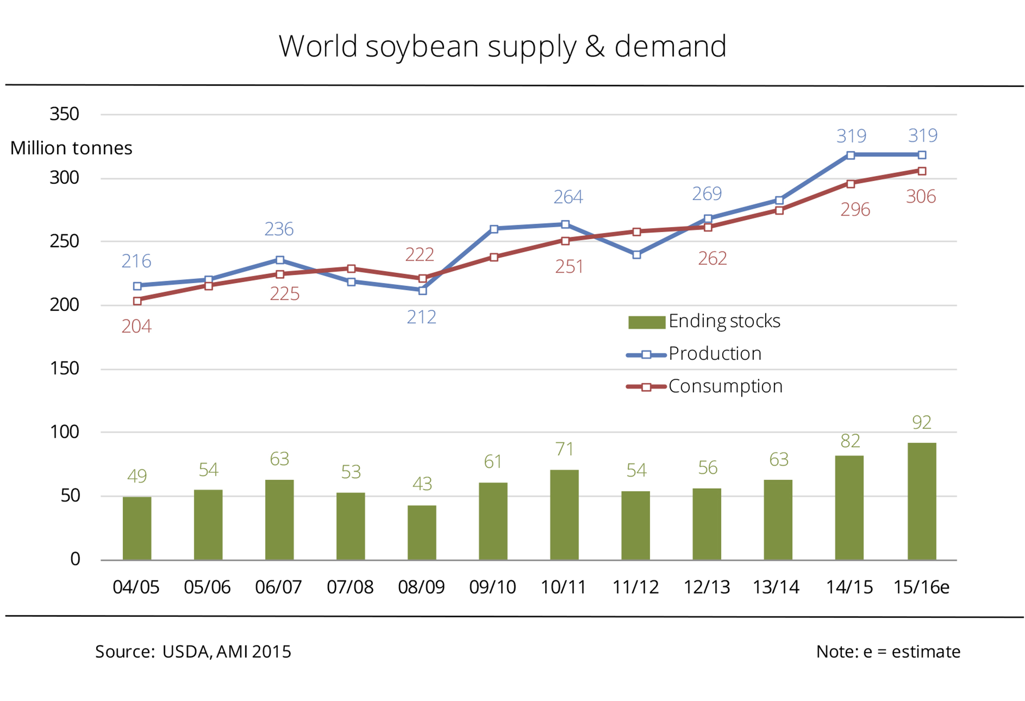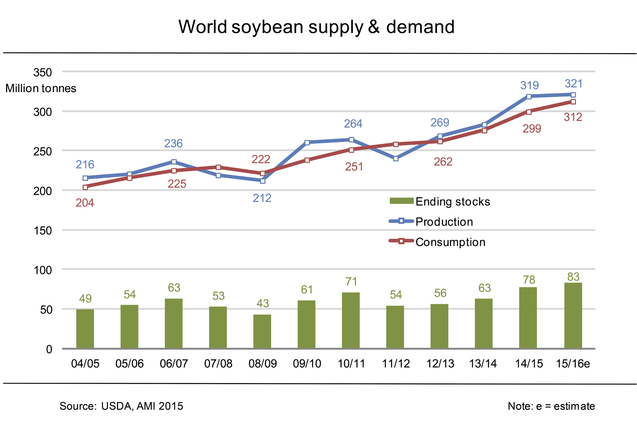 According to Agrarmarkt Informations-Gesellschaft (AMI), USDA raised its estimate of US soybean production massively by 2.5 million tonnes in November 2015. If realized, the currently projected output of 108 million tonnes would outpace the previous year's record high by 1.5 million tonnes. USDA's significant adjustment is based on higher yields. The average crop yield per hectare is now put at 32 decitonnes. This is an all-time high. Global soybean production in 2015/16 is now estimated to increase to 1.5 million tonnes above the previous year's level. The forecast is unchanged for South America (100 million tonnes in Brazil and 57 million tonnes in Argentina) and lower than previously for India. Despite enormous production figures, final stocks as at the end of the 2015/16 marketing year could be significantly lower than originally expected as the export trade picks up and global processing increases, especially in China and Argentina. However, at 83 million tonnes, global soybean stocks would still be at the highest level ever recorded.