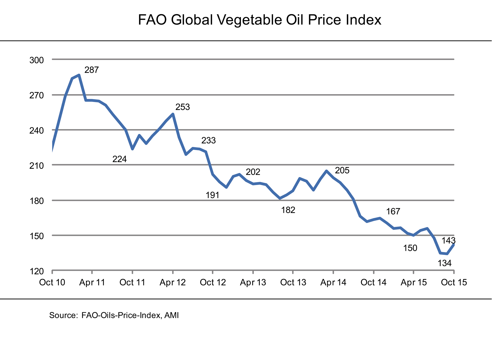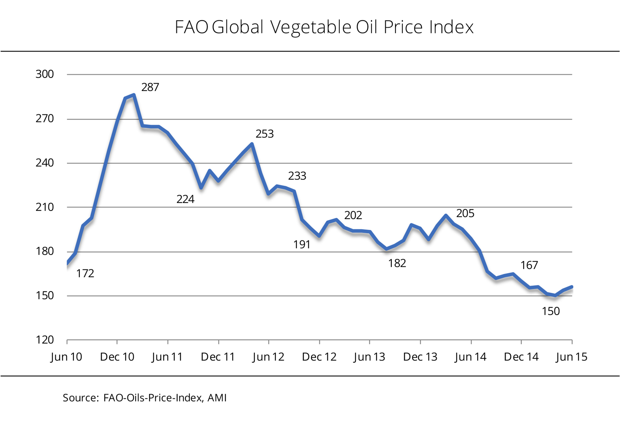 The FAO oils and fats price index averaged 156.2 points in June, continuing at the lowest level in almost six years. Since March 2014, world vegetable oil prices have fallen virtually continuously, by more than one fourth, due to extensive feedstock supplies. Above all, falling prices for palm, soybean and rapeseed oil beat the index down. Record world supply and a massive decline in mineral oil prices had a significant negative impact on 2014/15 prices. Because weak mineral oil prices diminish competitiveness of biodiesel, they also weigh down prices for vegetable oils used in biodiesel production. Since May 2015 there have been signs that the trend of the index will reverse. The trend is expected to be firm in the coming months, considering that El Niño could affect crop output in the South Asian palm oil producing countries and global 2015/16 rapeseed supply will tighten considerably. (AMI)