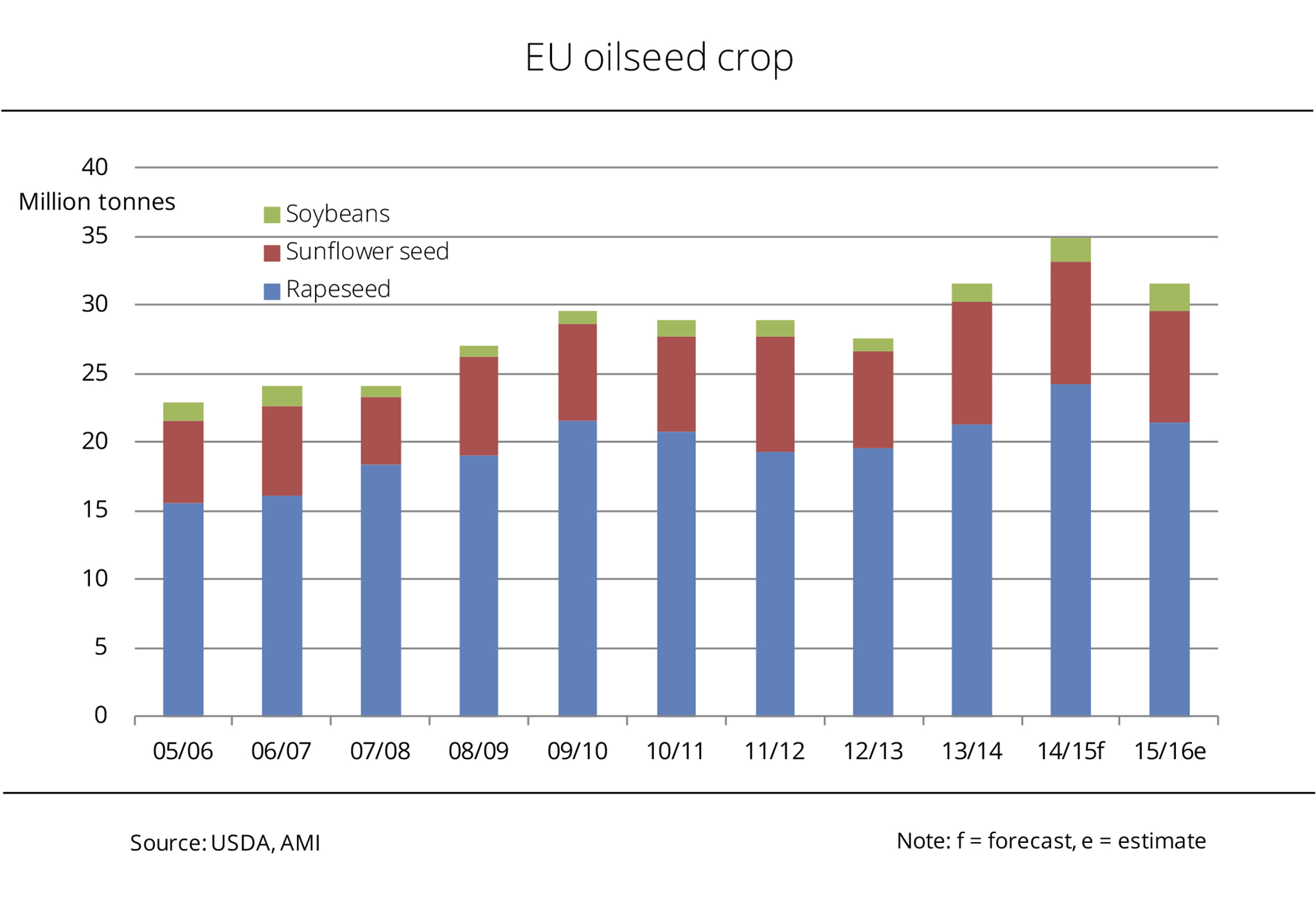 In the EU-28 in the 2015/16 marketing year, the amount of oilseeds harvested is much smaller than a year earlier. While the output is estimated at 31.6 million tonnes, the decline could amount to nearly 10 per cent. The dip is primarily attributable to rapeseed. Due to the reduction in rapeseed area and weather-related yield losses, total EU rapeseed harvest in 2015 will only yield an estimated 21.4 million tonnes. This would translate to an around 12 per cent drop from the previous year's record, but still exceed the long-time average. 2015/16 EU sunflower production is also expected to plummet, by approximately 8 per cent from the previous year, to 8.2 million tonnes. The drop is first and foremost due to a decrease in area planted in Bulgaria and France. By contrast, the main sunflower producing country Romania is reported to have expanded its sunflower area. Soybean production has seen an upward trend since 2012/13 and continues to grow in 2015/16. At nearly 2 million tonnes, the EU could harvest its biggest soybean crop ever. (AMI)