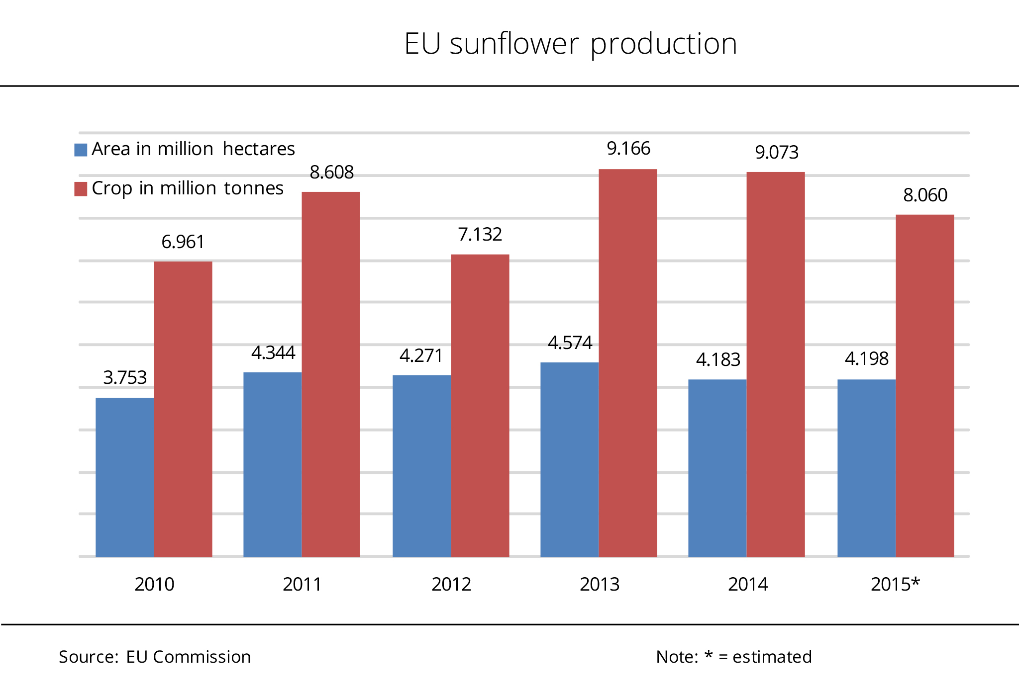 Following the excellent harvest figures for the previous two years, 2015 will see a marked cut in sunflowerseed production. Although all across the EU, the area planted with sunflowers was minimally expanded compared to the previous year, yields will fall short of the previous years' good figures. The EU Commission report puts the 2015 cultivation area at 4.2 million hectares. This would translate to a 0.4 per cent rise from the previous year. Following the dry spring and hot July, many countries, especially in southern Europe, lowered their crop forecasts dramatically in some cases. In other words, the current forecast for the EU-28 sunflower crop is 8.1 million tonnes, 11 per cent below the year-ago level. However, this isn't such a poor figure after all. Both area planted and harvest are merely 0.6 per cent and 1.6 per cent respectively below the long-standing average. (AMI)