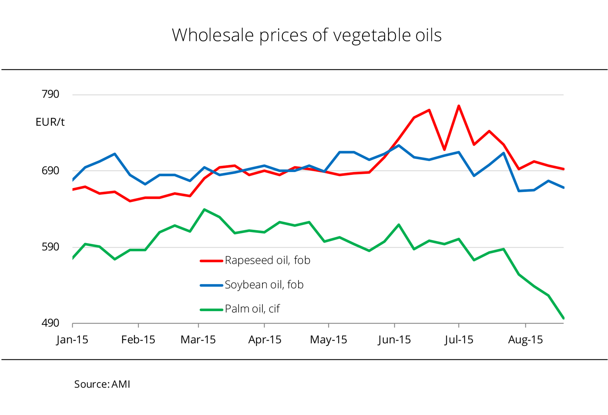 Whereas prices for rapeseed, soybean and sunflower oils are converging, palm oil prices continue to hover around a distant, significantly lower level, trending downward. Sales are virtually non-existent.