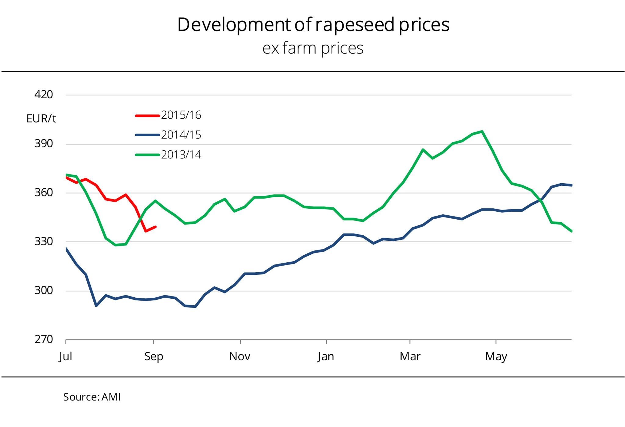 Weak prices for soybean and palm oil and, first and foremost, sliding crude oil prices put heavy pressure on quotes for rapeseed in August 2015. The nearby in Paris slumped below the mark of EUR 350 per tonne, reaching a six-month low. Although prices recovered slightly on only two days following massive losses of up to 4 per cent, volatility continues on the futures markets. Above all, this situation creates uncertainty and reluctance on the already weak cash market. Oil mill owners show little interest to buy and change their premiums hardly at all. As a result, the fluctuations on the futures markets have repercussions all the way down to the collection level. However, availability is also low, given the present farm prices that recently slumped significantly below the year-ago level. Having completed the harvest, farmers are leaving their crops in storage for the time being and probably till year-end. (AMI)