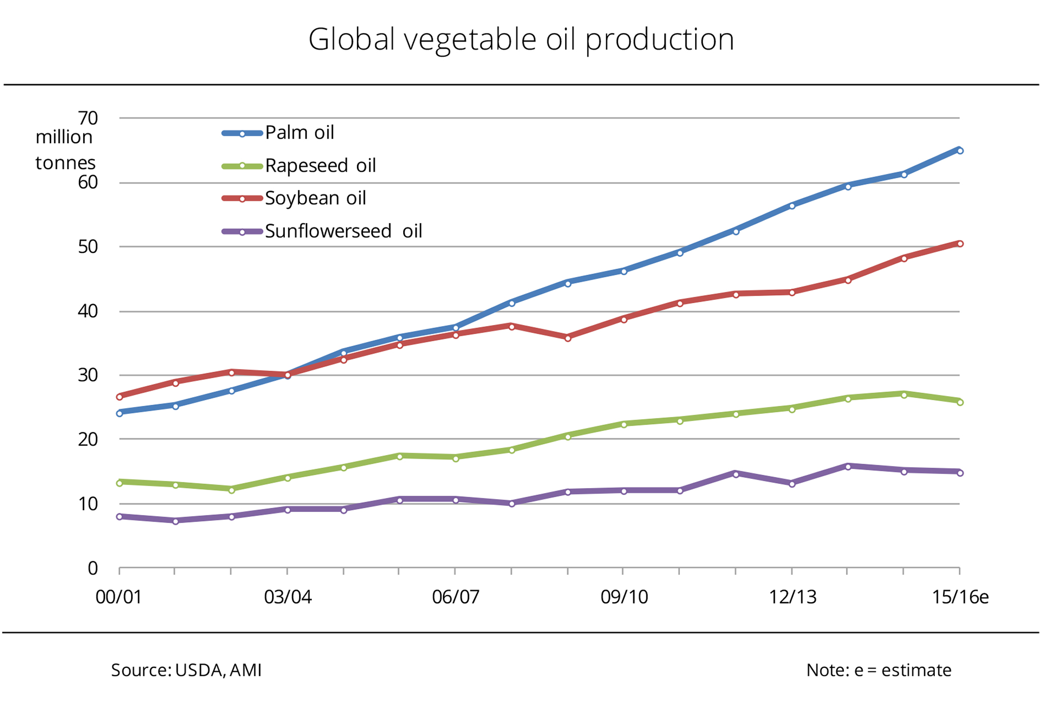 The global output of vegetable oils will generally increase. Data from the USDA indicates that global vegetable oil production in the coming marketing year 2015/16 will amount to 181 million tonnes, up approximately 6 million tonnes year-on-year. Palm, soybean, rapeseed and sunflower oils will presumably account for around 87 per cent of the total quantity. Palm oil has ranked first since 2004/2005 and since then has seen an annual grosth of on average 7 per cent. Over the same period, production of soybean oil rose by 4 per cent per annum. Whereas these two vegetable oils will likely continue on a rising trend in the future, the upward trend for rapeseed oil is probably over. USDA reports that for the first time since 2006/07, the chances are that rapeseed oil production will go down. Global output is forecast at 26.65 million tonnes, down 2 per cent from the previous year. The EU-28 output might even drop by 3 per cent. (AMI)