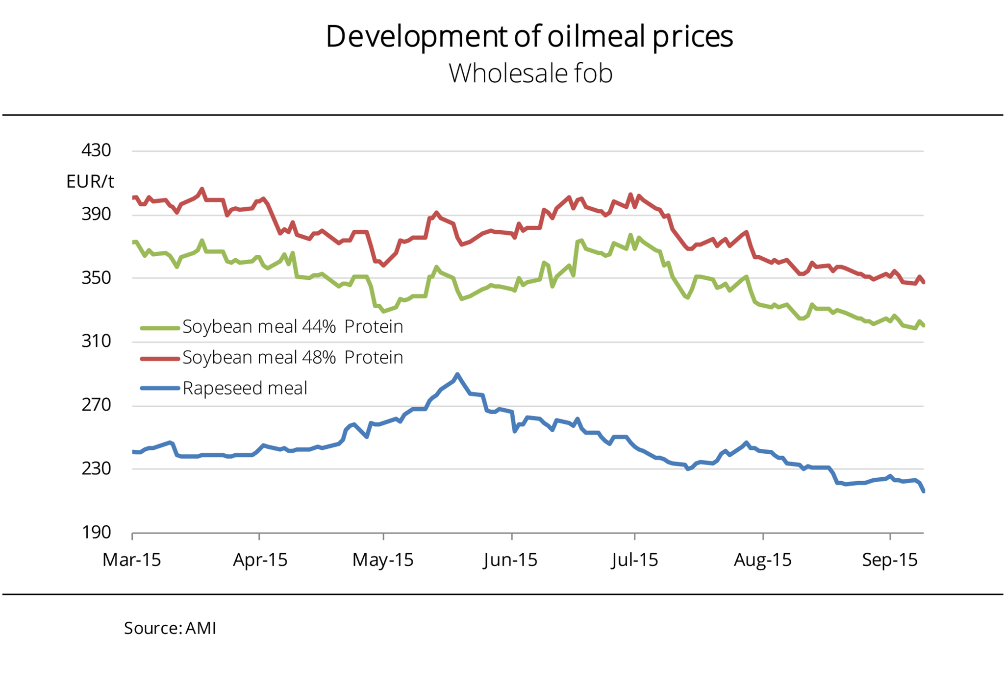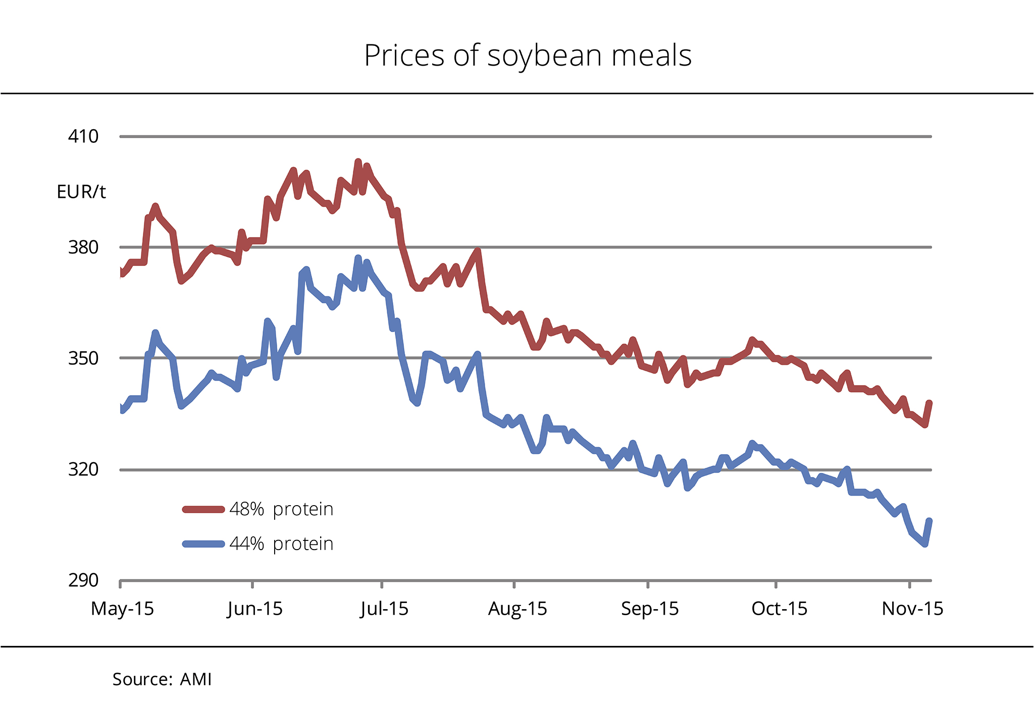 Prices of soybean meal have dwindled considerably. Nearby material is currently down almost one fifth from the July 2015 figure. Downward pressure on prices came, first and foremost, from weak US reference prices for soybean meal and sluggish demand.