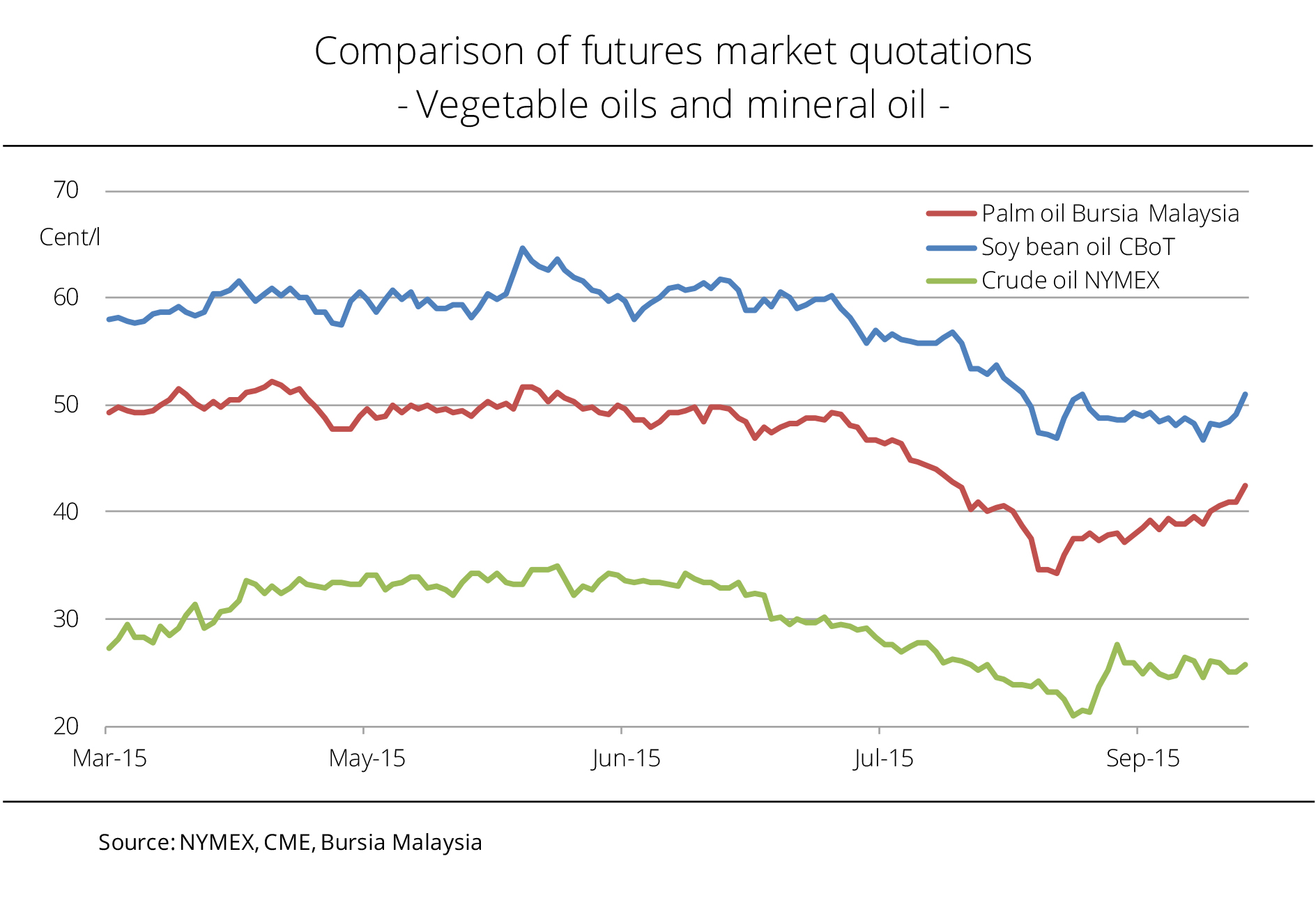 According to Agrarmarkt Informations-Gesellschaft (AMI) the index was first and foremost driven by rising prices for palm oil, the single most important vegetable oil included in the index. In other words, prices have recovered from their summer low in the wake of prospects for a slump in Southeast Asian (especially Indonesian) production, El Niño and surging demand on the global market. At the same time, prices for soybean oil also climbed on occasionally keen buyer interest and difficult sowing conditions in Brazil, South America's top soy producing country. The index also went up due to the bullish effect of declining global supplies of rapeseed and sunflower oil.