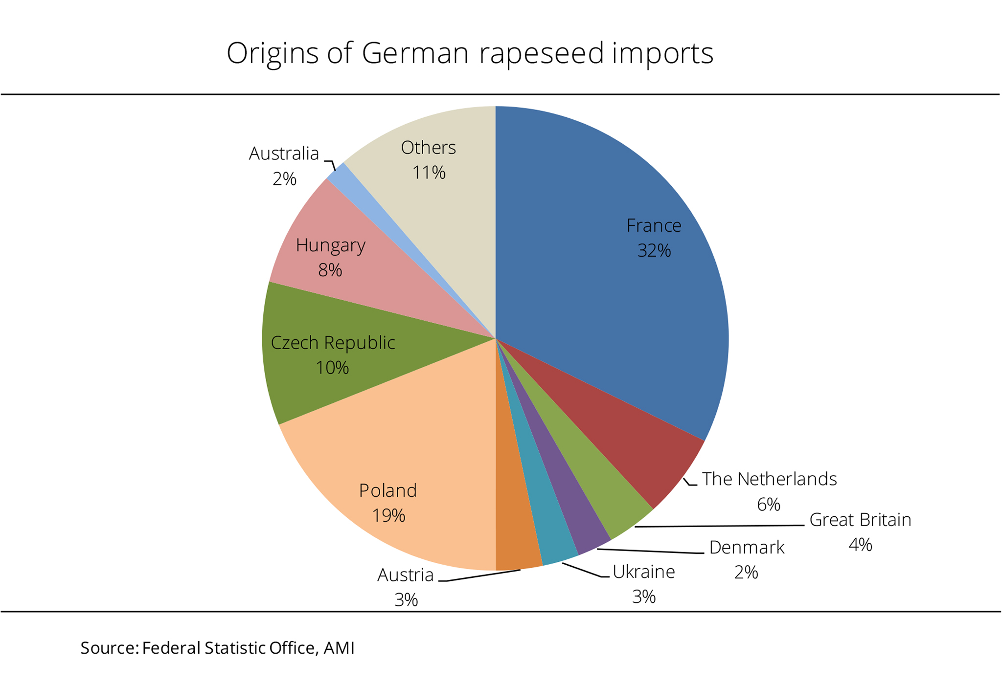 In the 2014/15 marketing year, Germany received 4.7 million tonnes of rapeseed from abroad, 10 per cent more than the previous year. The largest part came traditionally from France (just over 1.5 million tonnes). Consequently, imports from France more than doubled over the past three years. Like the previous year, Poland was the second largest supplier in 2014/15, delivering nearly 900,000 tonnes. The was up just over one fourth from 2013/14. The Czech Republic took third place again. German imports from there amounted to approximately 472,000 tonnes, dropping just slightly from a year earlier. Just over 94 per cent of total German rapeseed imports came from EU countries. This was a 5 per cent rise from 2013/14. Meanwhile, imports from the two key third countries delivering rapeseed to Germany (Australia and Ukraine) dropped sharply. Rapeseed imports from Australia slumped by nearly one third, whereas those from Ukraine nearly dropped by half. (AMI)