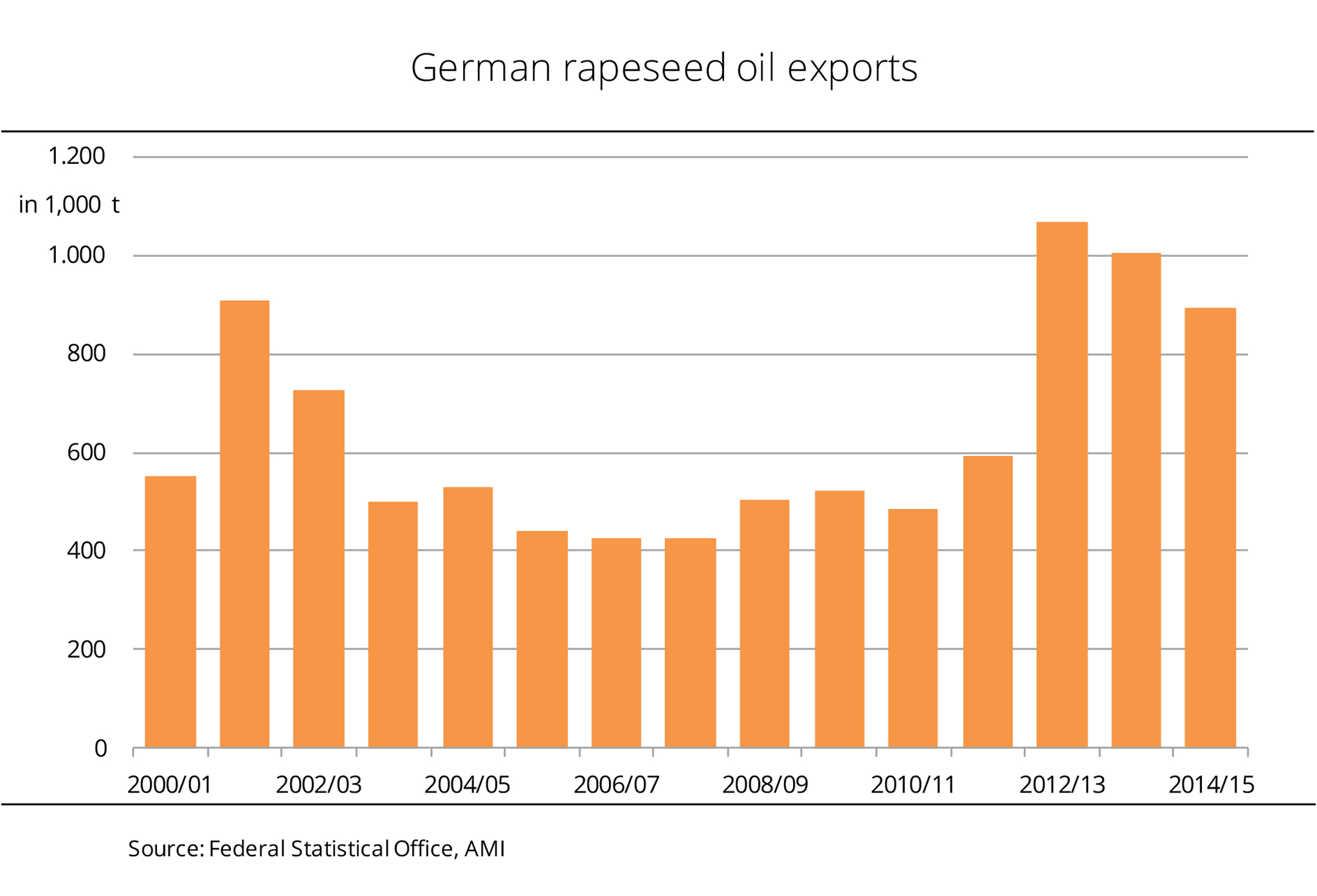 According to Agrarmarkt Informations-Gesellschaft GmbH (AMI), Germany was the single most important supplier in the intra-Community trade, delivering around 823,400 tonnes. The country was followed, a long way behind, by Poland, the Czech Republic and the Netherlands. In 2014 exports to third countries, German origins ranked second, at just under 46,100 tonnes, behind the Netherlands. The latter shipped 93,800 tonnes to non-EU countries, some of which was likely rapeseed oil from German oil mills. These figures highlight the role of the Netherlands as a hub of international trade. Great Britain took third place, exporting 29,600 tonnes to third countries.