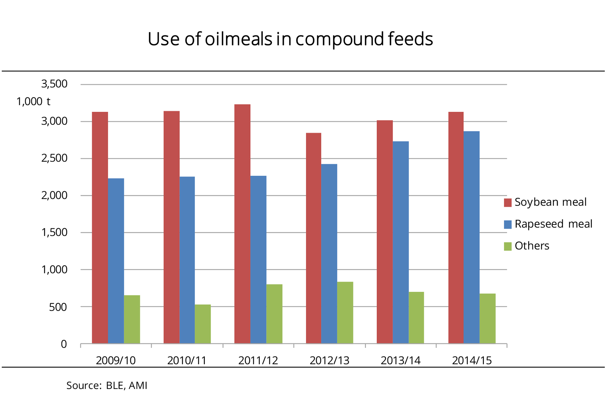The use of oilseed meals in compound feeds continued to rise in the past marketing year, reaching just less than 6.7 million tonnes. This translates to a 3.4 per cent rise from 2013/14. At the same time, the trend in oilseed use was mixed. Rapeseed and soybean meal went up, whereas at a total of 671.00 tonnes, the use of other oilseed meals, such as sunflower, linseed, palm and coconut meals, dropped again, sliding below the long-term average. Rapeseed meal surged by 5 per cent, to 2.9 million tonnes, and soybean meal by 4 percent, to 3.1 million tonnes. Consequently, the two oilseeds are increasingly converging. Whereas five years ago, these figures differed by just under 900,000 tonnes, by 2014/15 the difference had melted down to 265,000 tonnes. And this had nothing to do with prices advantage. In 2009/10, low-protein soybean meal (44 %) cost twice as much as rapeseed meal (EUR 300 per tonne fob). In 2014/15, it was only 60 per cent more expensive. (AMI)