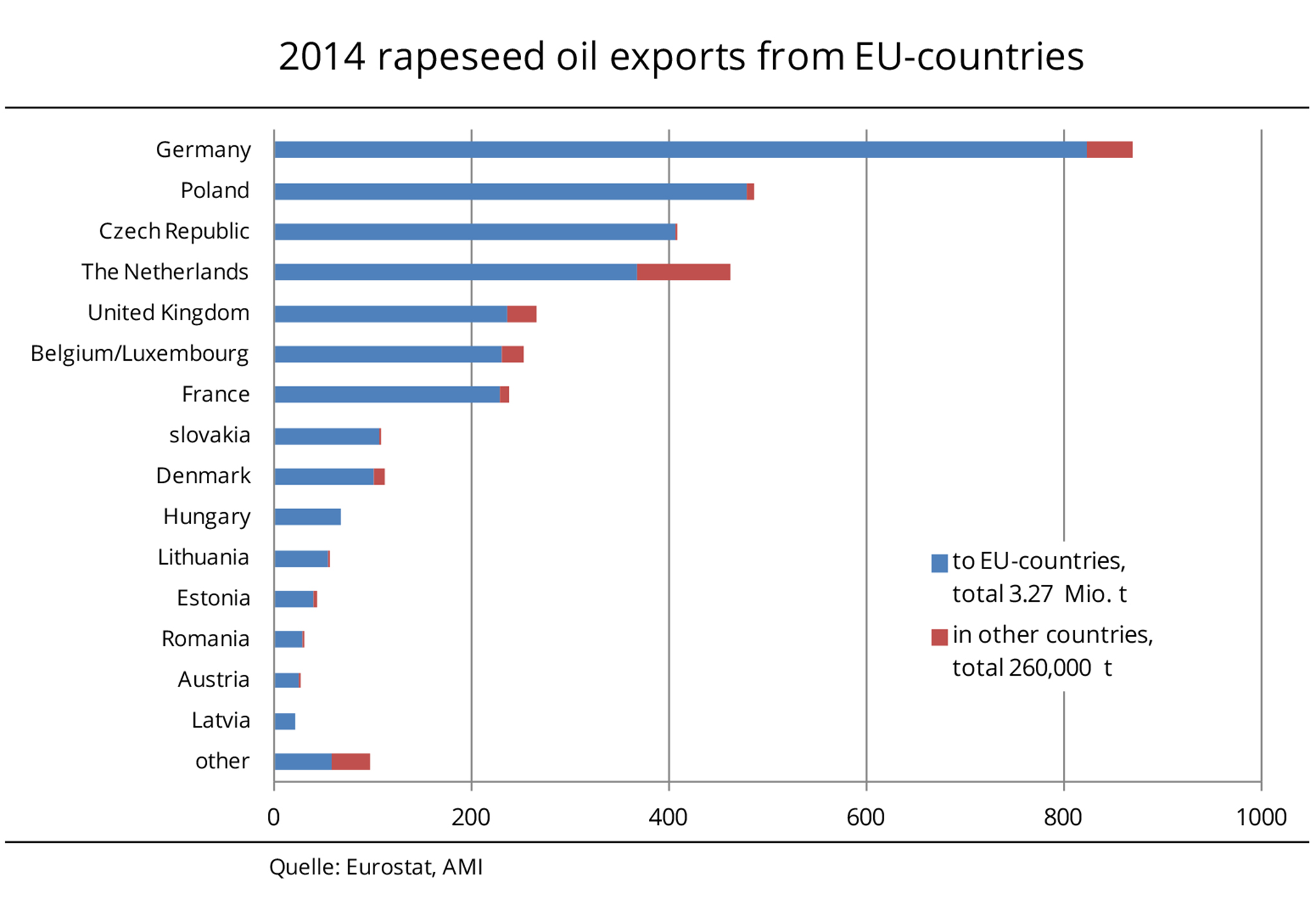 In 2014, exports of the EU-28 member states to third countries amounted to 260,000 tonnes in total. At the same time, trading of rapeseed oil within the Community was in excess of eleven times this quantity, totalling 3.3 million tonnes.