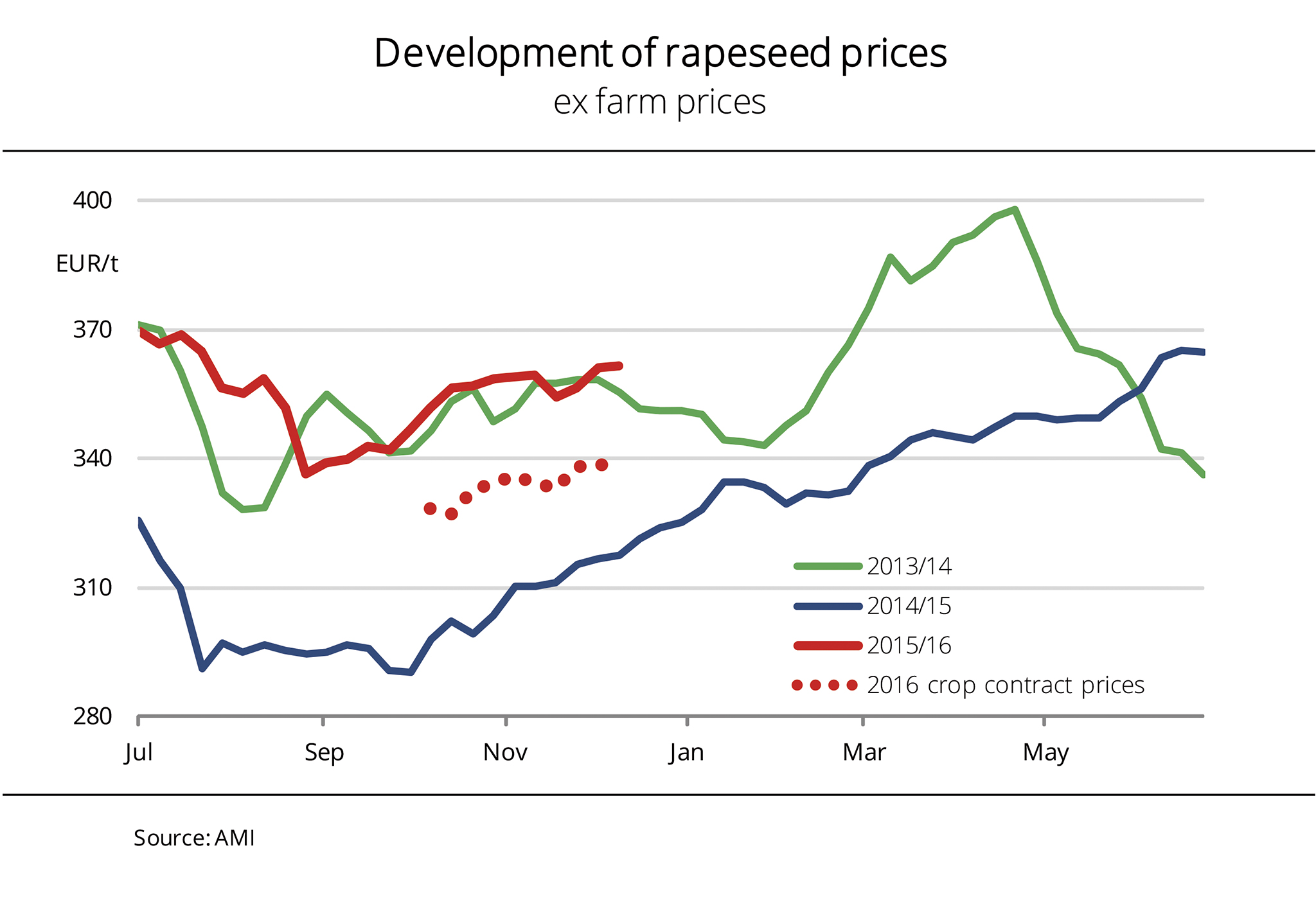 Although the area planted with rapeseed was reduced and yields have come down significantly from the previous year, 2015/16 global supply of rapeseed will probably be better than predicted a few months ago. Ending stocks are forecast at 6.5 million tonnes while the estimate in august 2015 has been around 50 percent lower. Nevertheless, the dip from 2014/15 amounts to around 16 per cent. According to Agrarmarkt Informations-Gesellschaft mbH (AMI), the key reason for the better prospect is that the Canadian harvest estimate has been raised considerably, to 17.2 million tonnes. Thus, rapeseed production surpasses the previous year's level by just under 5 per cent due to a massive rise in yields, whereas the market previously expected a 13 per cent decline. By contrast, Indian farmers are bringing in a significantly smaller harvest due to severe drought. However, the surge in Canadian output and drop in global crushing use more than offset this decline.