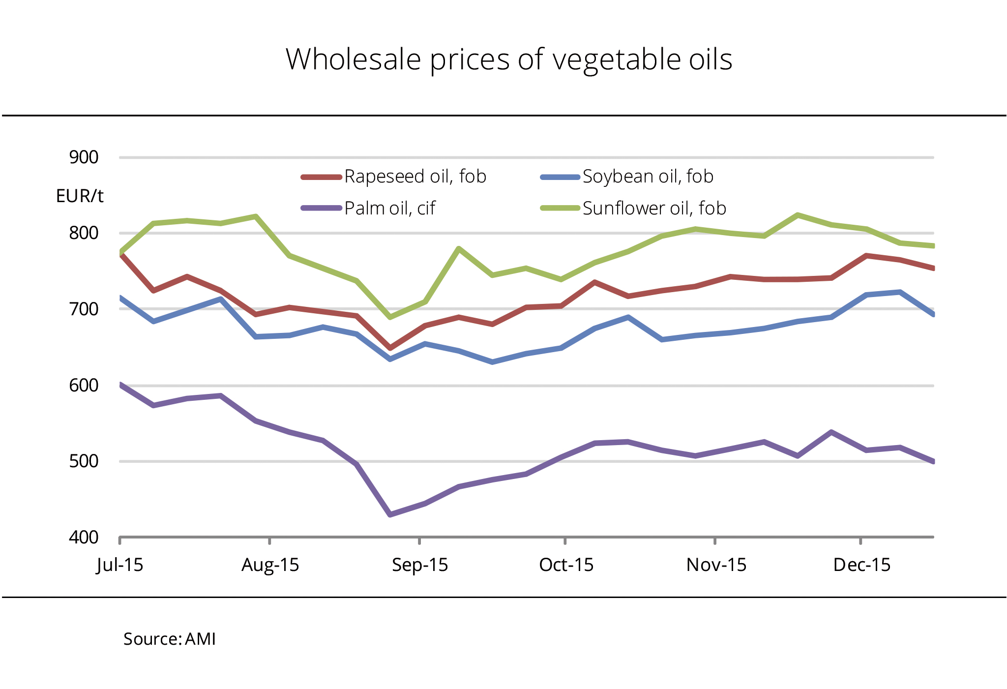 December 2015 trade in vegetable oils has been slow. Volatile futures market reference prices for crude oil, soybean oil and palm oil and strong fluctuations of currency dampen the mood and cause concerns among market participants, Agrarmarkt Informations-Gesellschaft mbH (AMI) reports. Demand is slack, especially because buyers are stocked up well into the new year. At the same time, supply is not abundant but adequate, considering the fact that buyer interest is small. Prices for rapeseed and soybean oils eased on weak feedstock reference prices in mid December 2015. Sunflower oil continues to be the most expensive vegetable oil. By contrast, palm oil prices are at a distant, very low level. Slow demand and Malayan supplies hitting a 15-year high put downward pressure on prices both in Kuala Lumpur and on the European cash market.