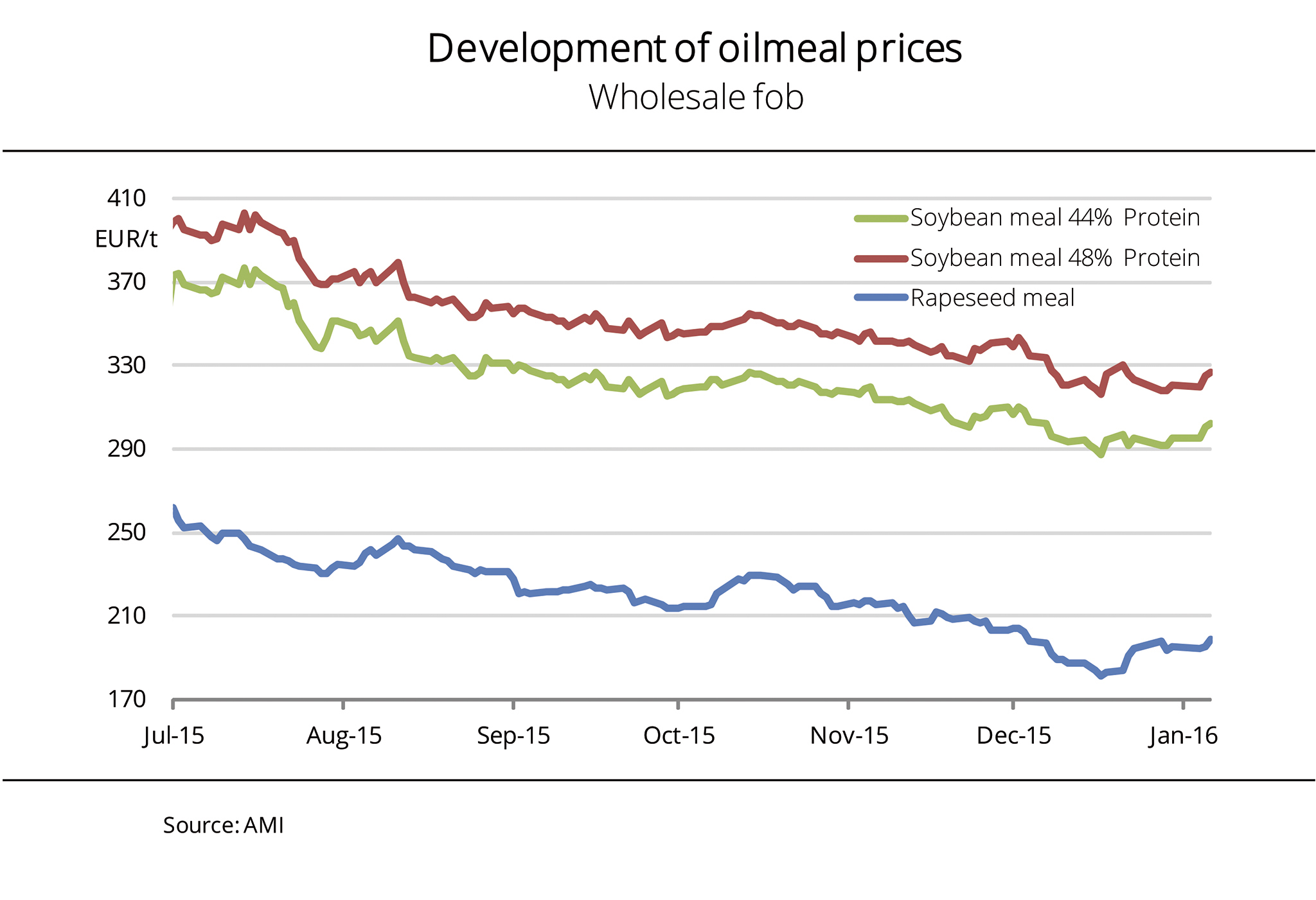 At the beginning December 2015, overabundant supply and slack demand sent oilseed meal prices on the cash market skidding to a four-year low. Rapeseed meal temporarily cost only around EUR 180 per tonne fob mill, whereas soybean meal (44% protein) approached the mark of EUR 290 per tonne fob Hamburg. According to Agrarmarkt Informations-Gesellschaft (mbH), the downward slide stopped immediately before Christmas in the wake of rising feedstock prices in Paris and Chicago. The temporary decline of the euro also drove up prices for imported soybean meal. Asking prices recently climbed to a one-month high. However, the long-term price trend is weak because global supply of feedstock is at a record high. Most recently, rapeseed meal approached the EUR 200 per tonne mark, although demand continues to be limited to nearby positions.
