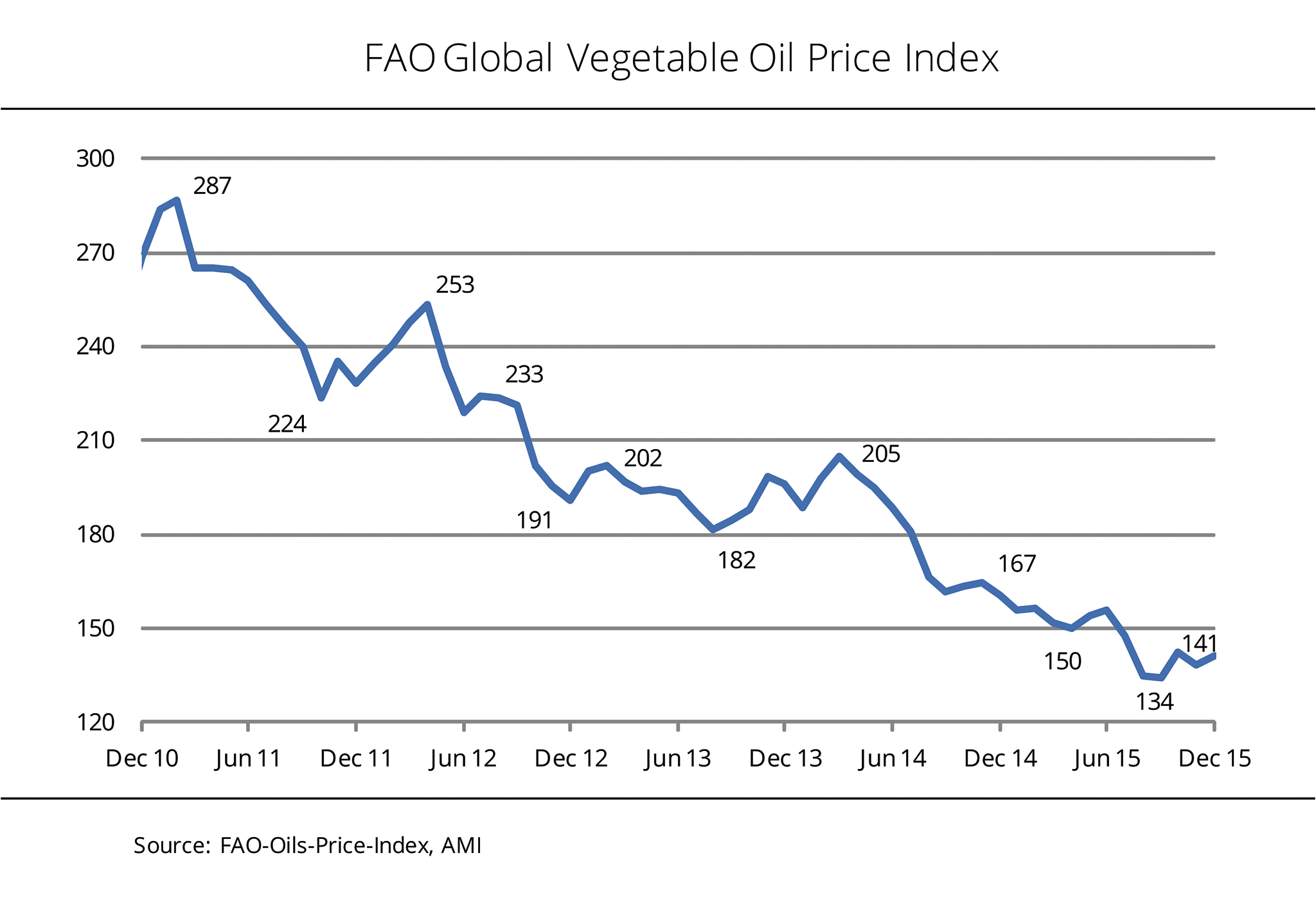 The vegetable oil price index of the Food and Agriculture Organization of the United Nations (FAO) rose by almost 2 per cent in December 2015, but continues at a nine-year low even though biodiesel production has increased. The downward slide came to a halt in December 2015 for the time being. The reason was that prices for soybean oil surged, hitting a six-month high in the wake of reduced global feedstock supply and growing demand. At the same time, prices for palm oil, the most important vegetable oil, were stable. Continued fears that the weather could have a negative impact on crop output in Southeast Asia had offset slow demand, Agrarmarkt Informations-Gesellschaft mbH (AMI) reported. Nevertheless, at 141 points, the December index was one fifth below the previous year's level. The FAO price index measures the changes in international prices for ten different vegetable oils, weighted with their shares in world trade.