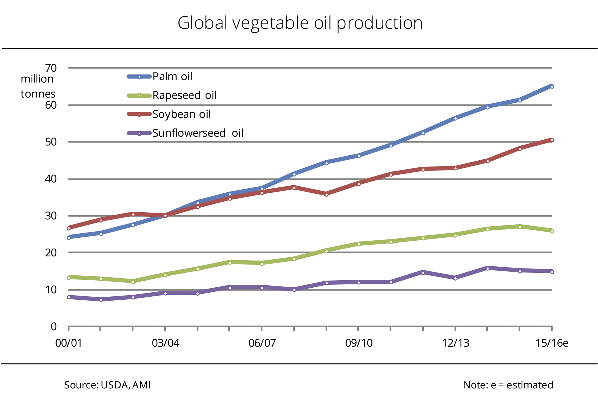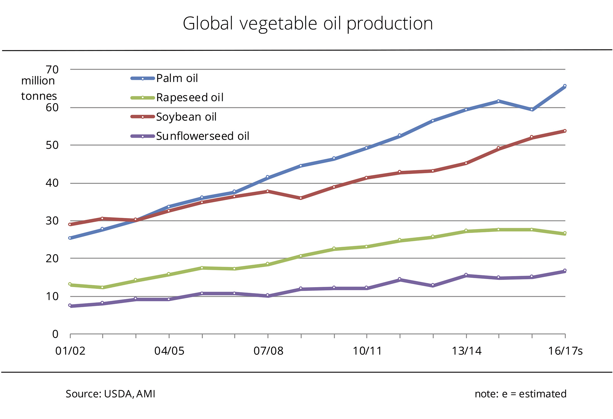 Global soybean oil production rises approximately 5 per cent, based on the 2015/16 record supply of feedstock. By contrast, production of rapeseed oil declines from the previous year. Smaller and, consequently, more expensive feedstock supply increases competition with other oils.