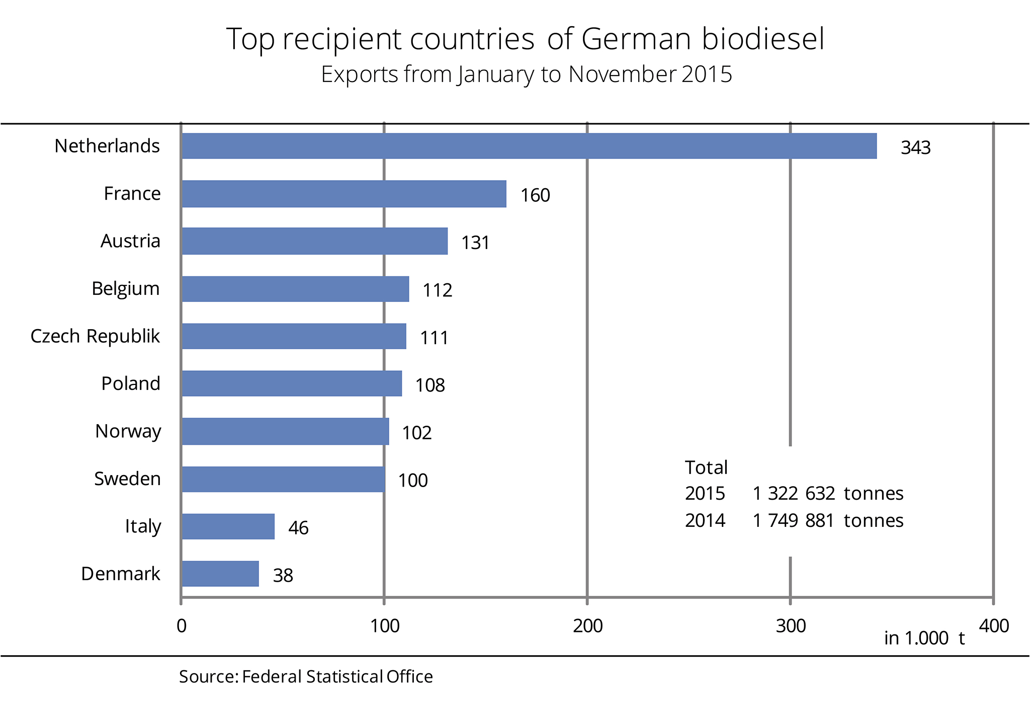 German biodiesel exports in the first 11 months of 2015 were down almost one fourth from same period in 2014. This is shown by German Federal Statistical Office foreign trade figures. A respectable 90 per cent of exports went to EU member states.