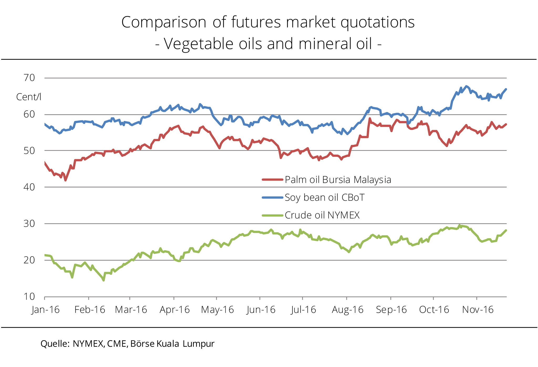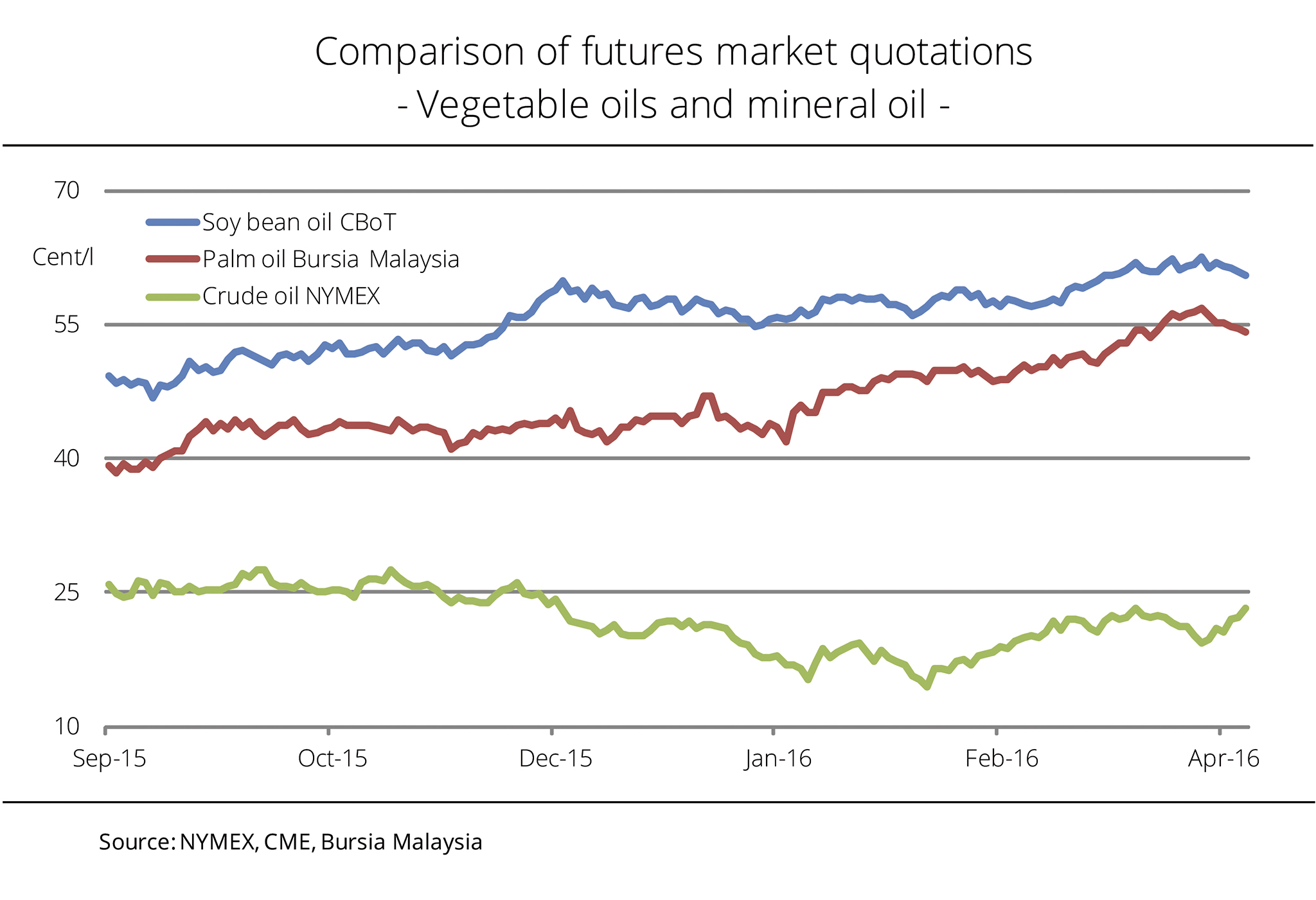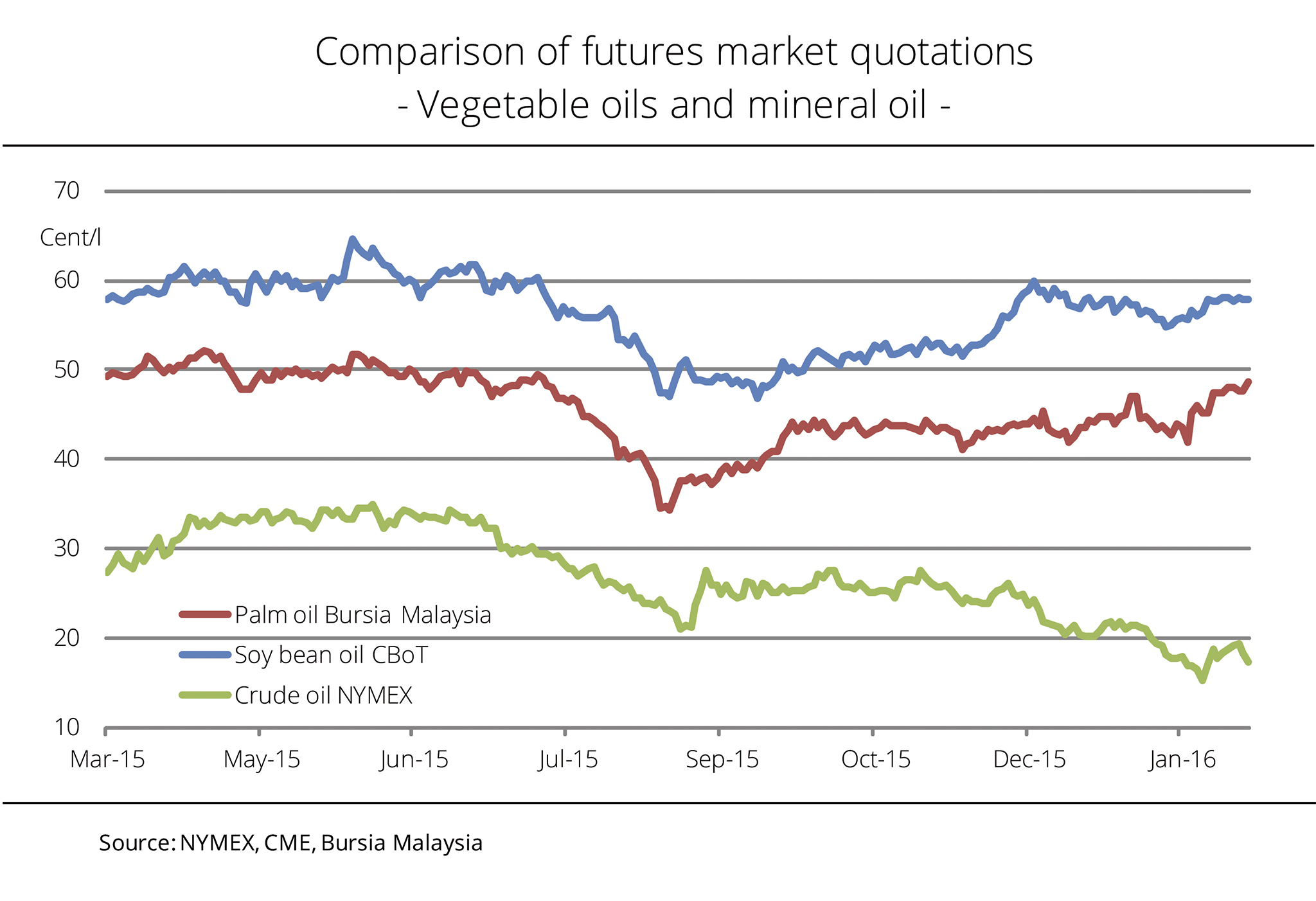 Global surplus put strong downward pressure on crude oil prices on the futures market. Positive stimuli usually only had a short-term effect. Although prices on the NYMEX temporarily surpassed the mark of USD 30 per barrel at the end of January 2016, they remained at the lowest level in 12 years. According to Agrarmarkt Informations-Gesellschaft mbH (AMI), palm oil prices continued to benefit from fears of reduced crop yields in Southeast Asia in the wake of the El Niño phenomenon. Soybean oil prices in Chicago also recorded gains based on firm feedstock prices.